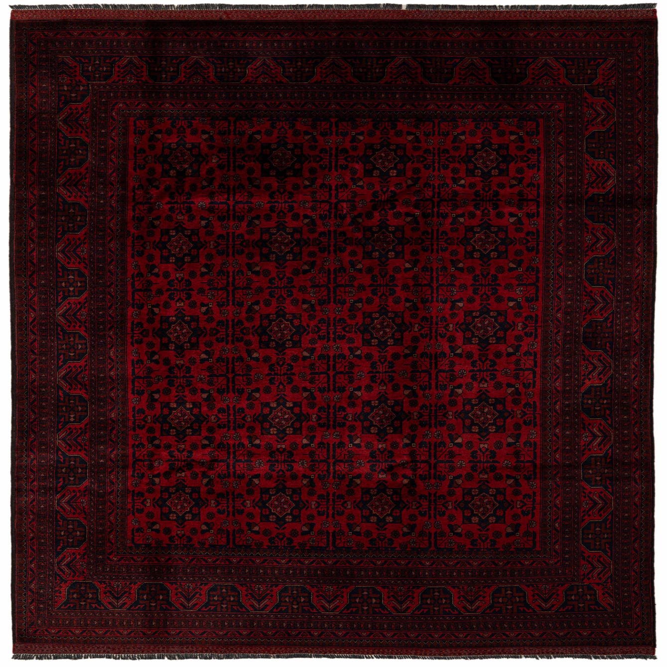 A 7x10 rectangular Khal Mohammadi rug in deep reds with intricate dark blue and black oriental patterns, featuring a detailed border.