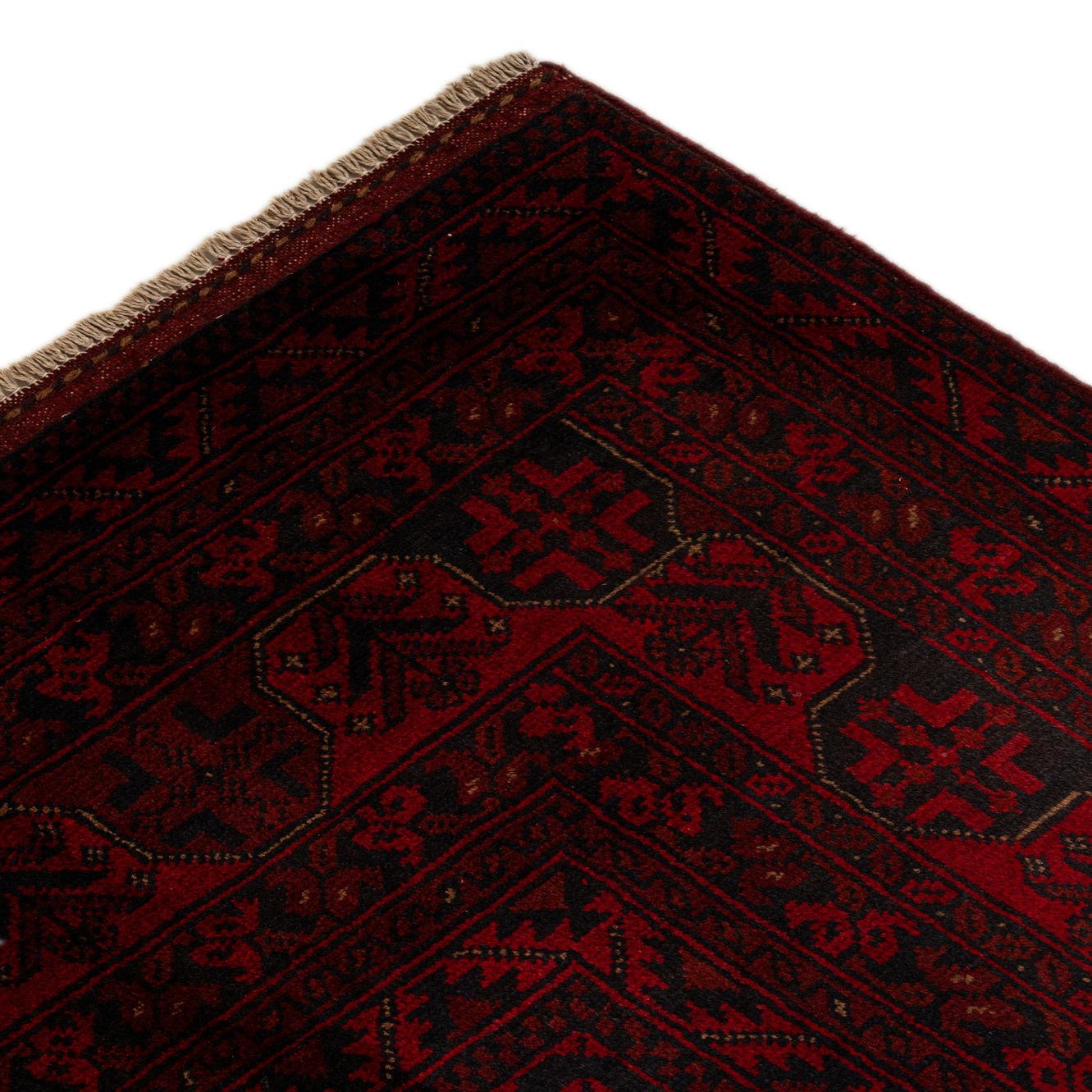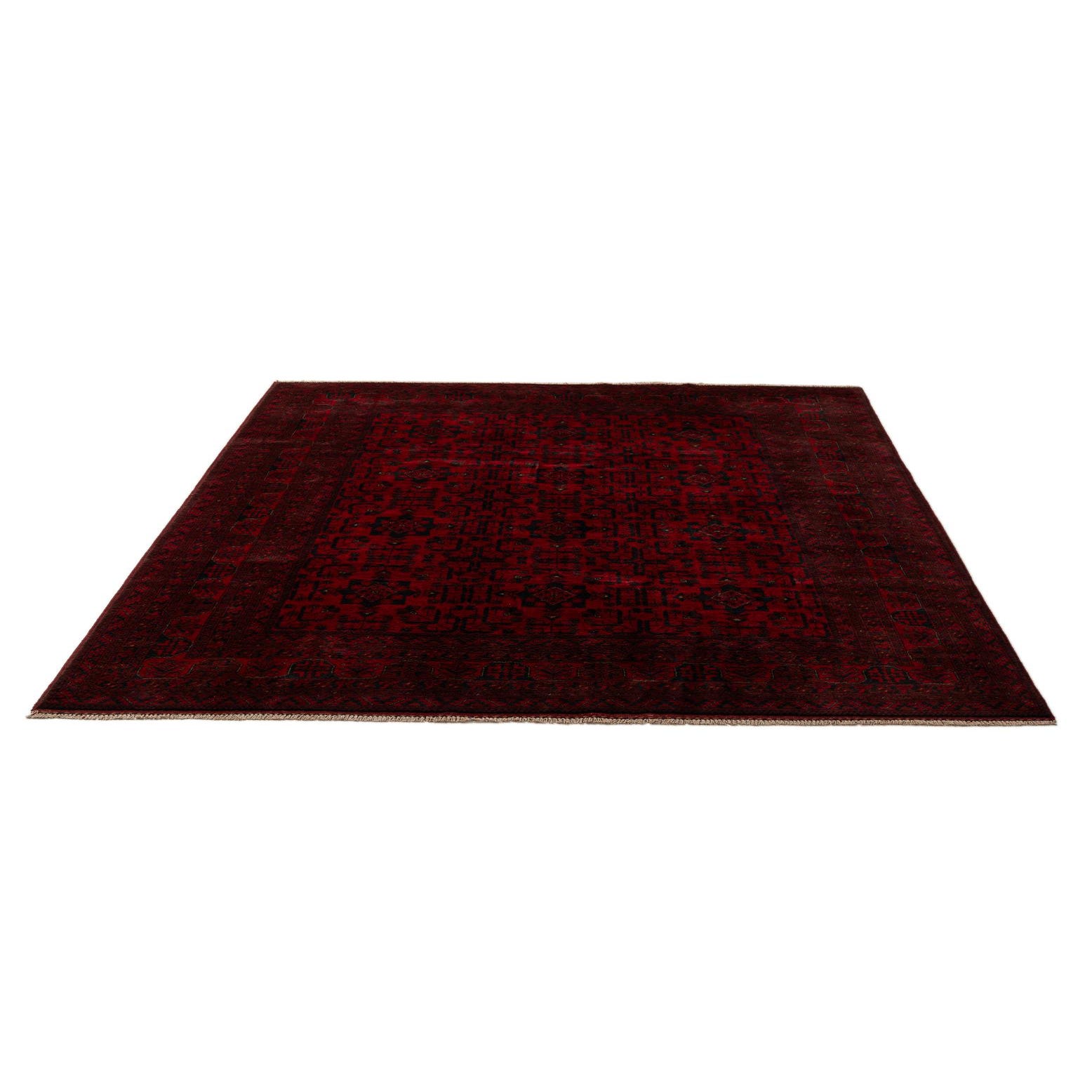 A 7x10 rectangular Khal Mohammadi rug in deep reds with a traditional black geometric pattern and a detailed border.