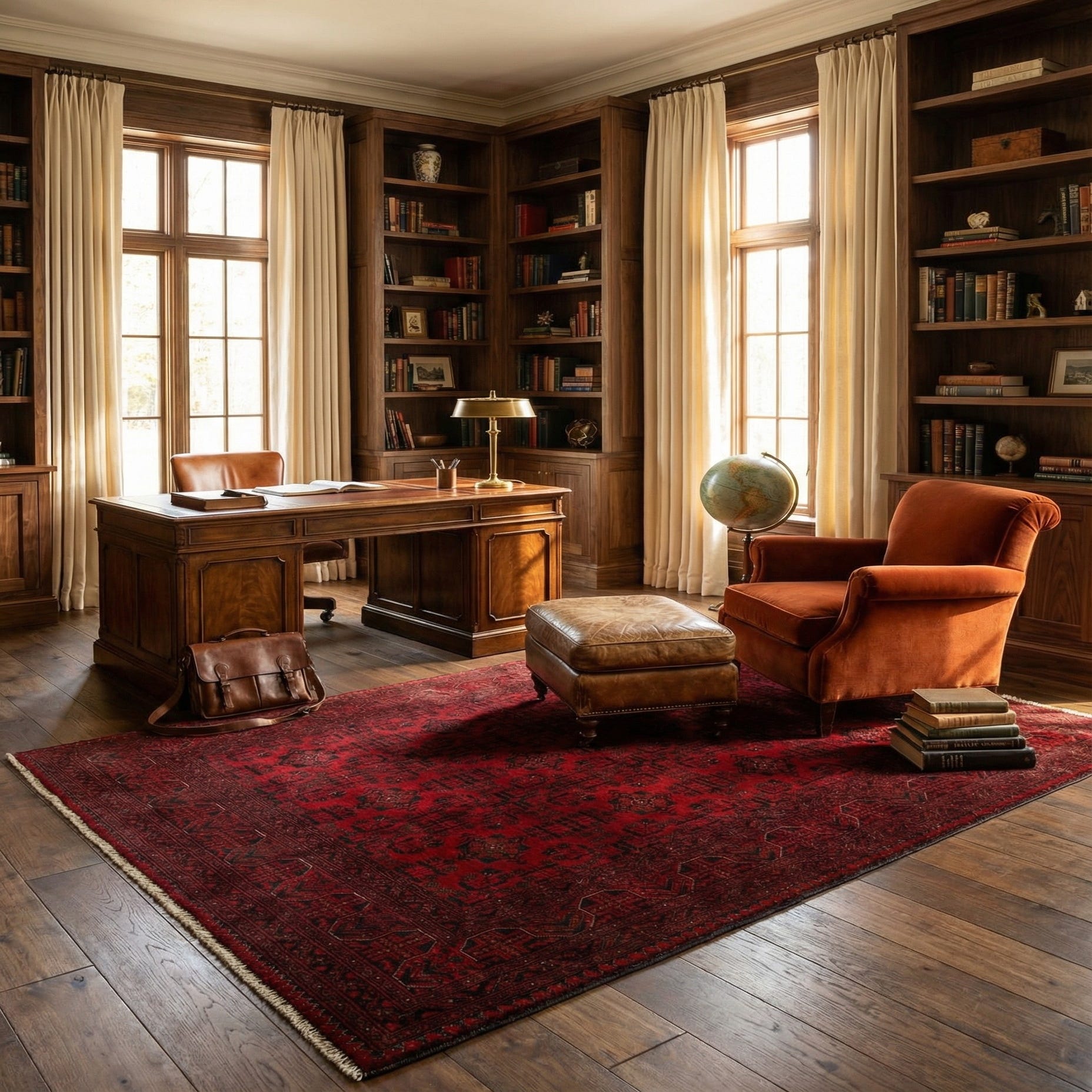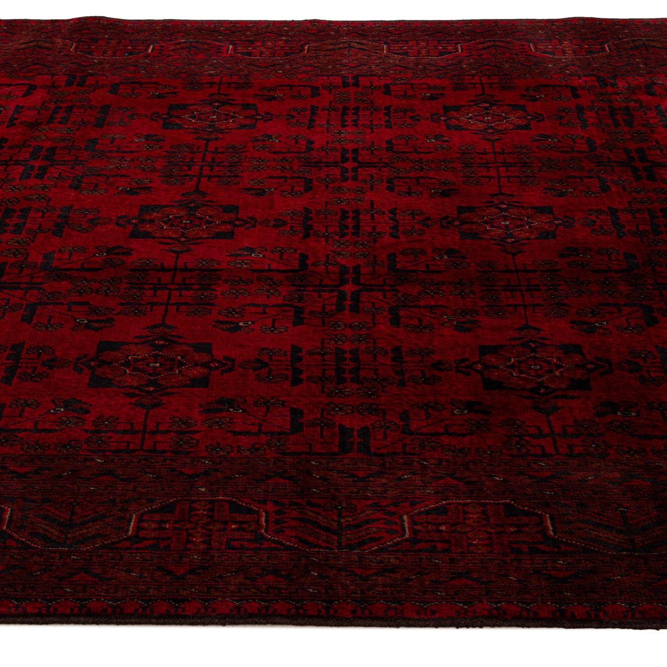 A 7x10 rectangular Khal Mohammadi rug in deep reds with a traditional oriental pattern, suitable for a living room.