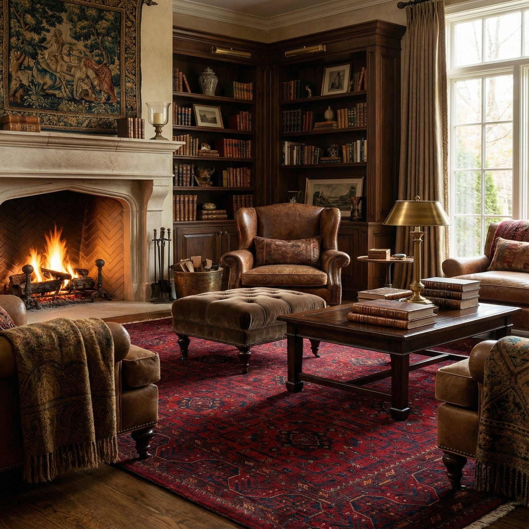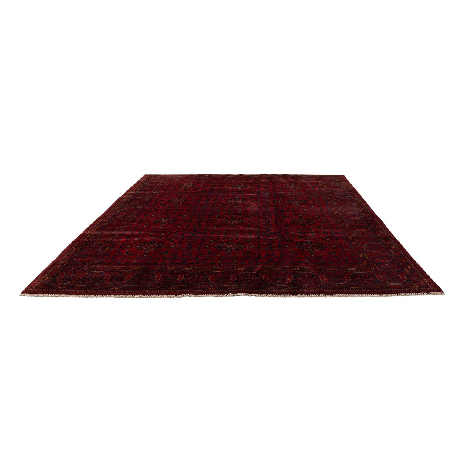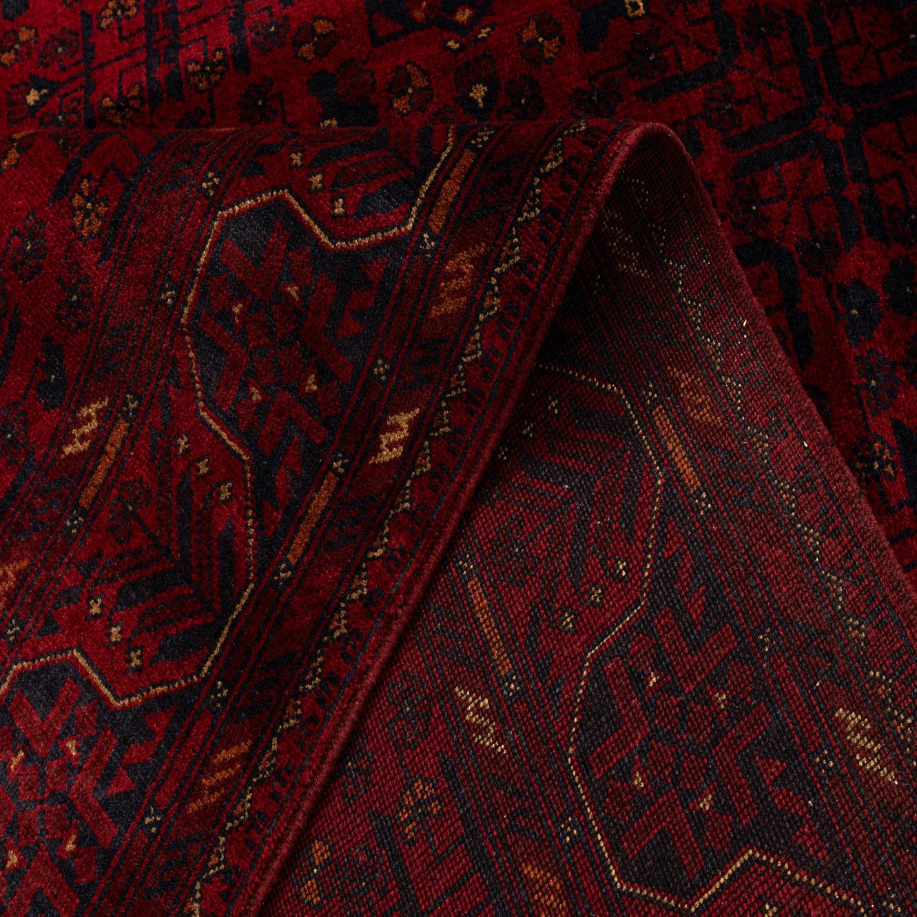A 7x10 rectangular Khal Mohammadi rug in deep reds with intricate traditional patterns, suitable for a living room.