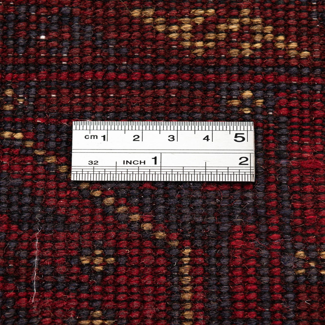 Primary color is Red. Colors in this rug include: Red, Brown, Navy Blue.