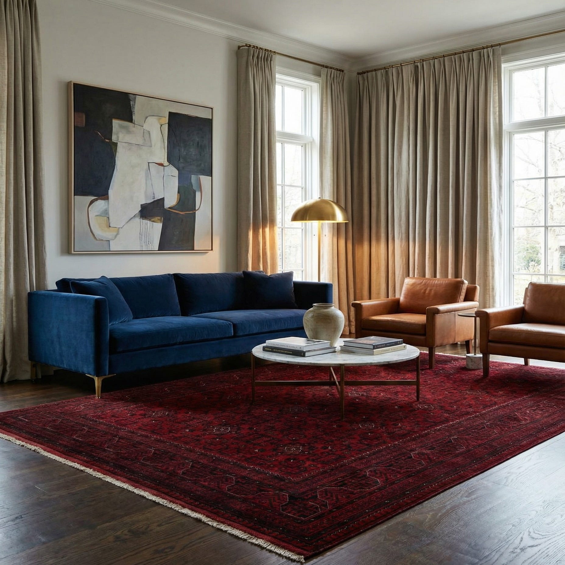 A 7x10 rectangular Khal Mohammadi rug in deep reds with a detailed oriental pattern, suitable for a living room.