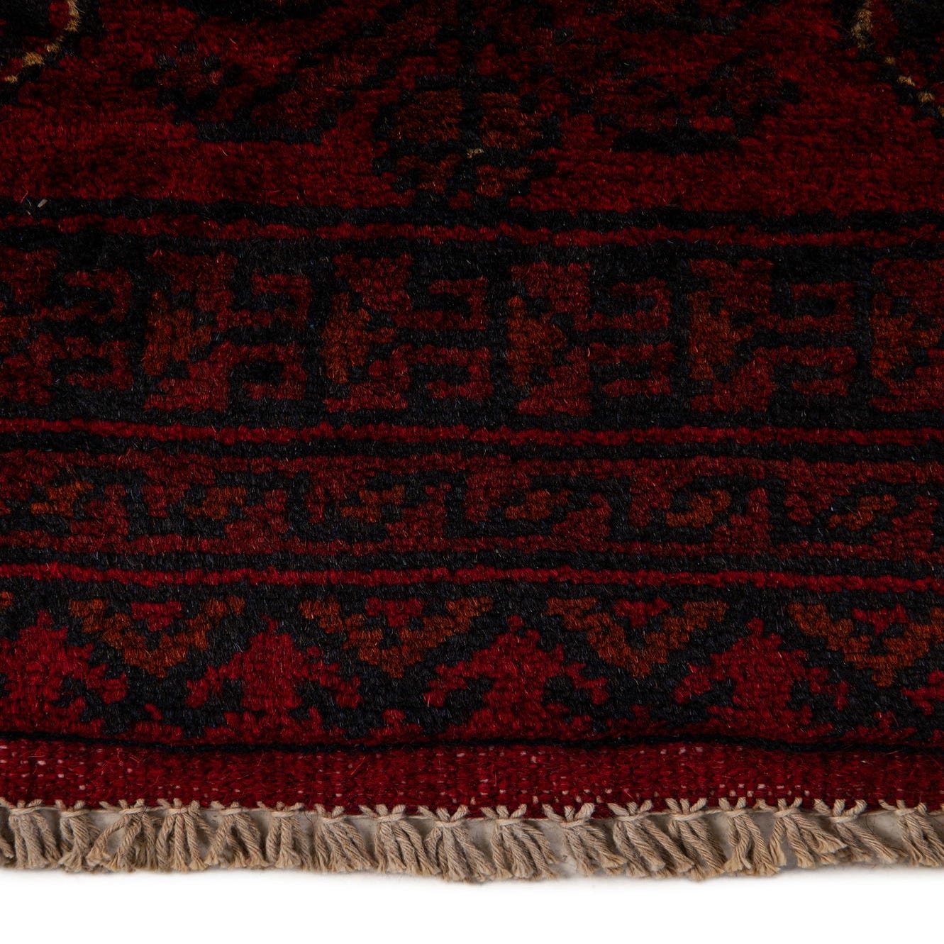 Primary color is Red. Colors in this rug include: Red, Black, Brown, Ivory.