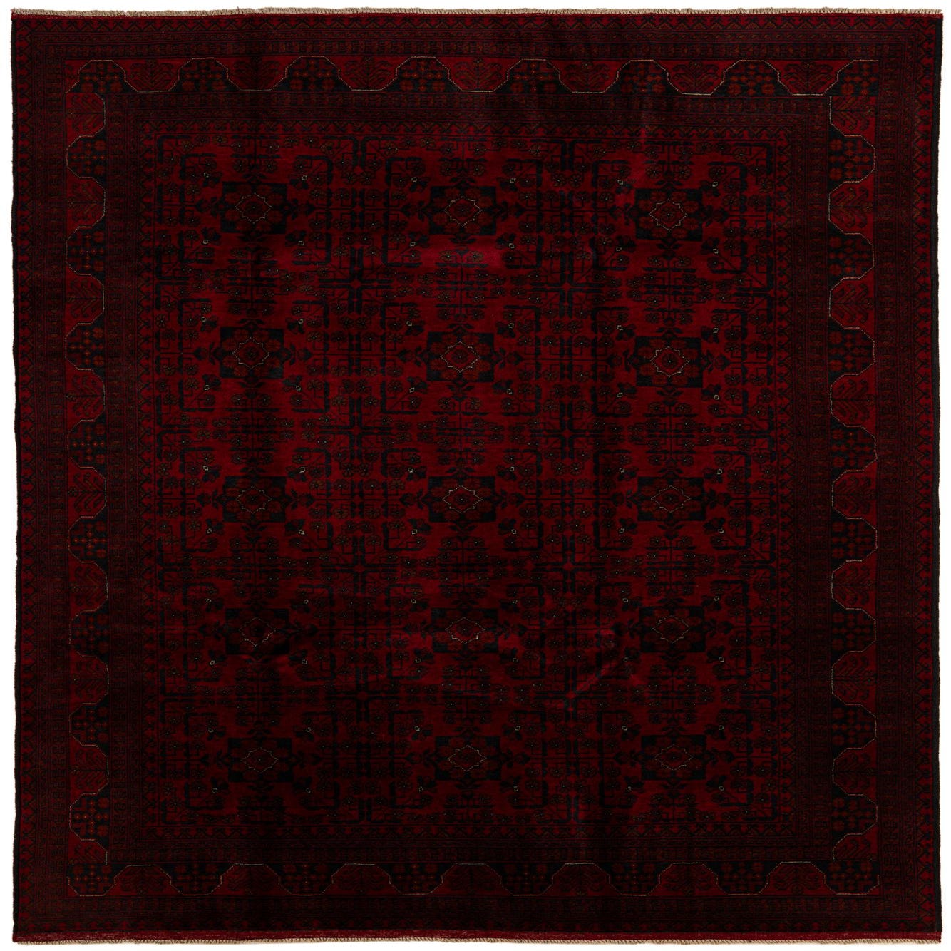 A 7x10 rectangular Khal Mohammadi rug in deep red with intricate black Oriental patterns, suitable for a living room.