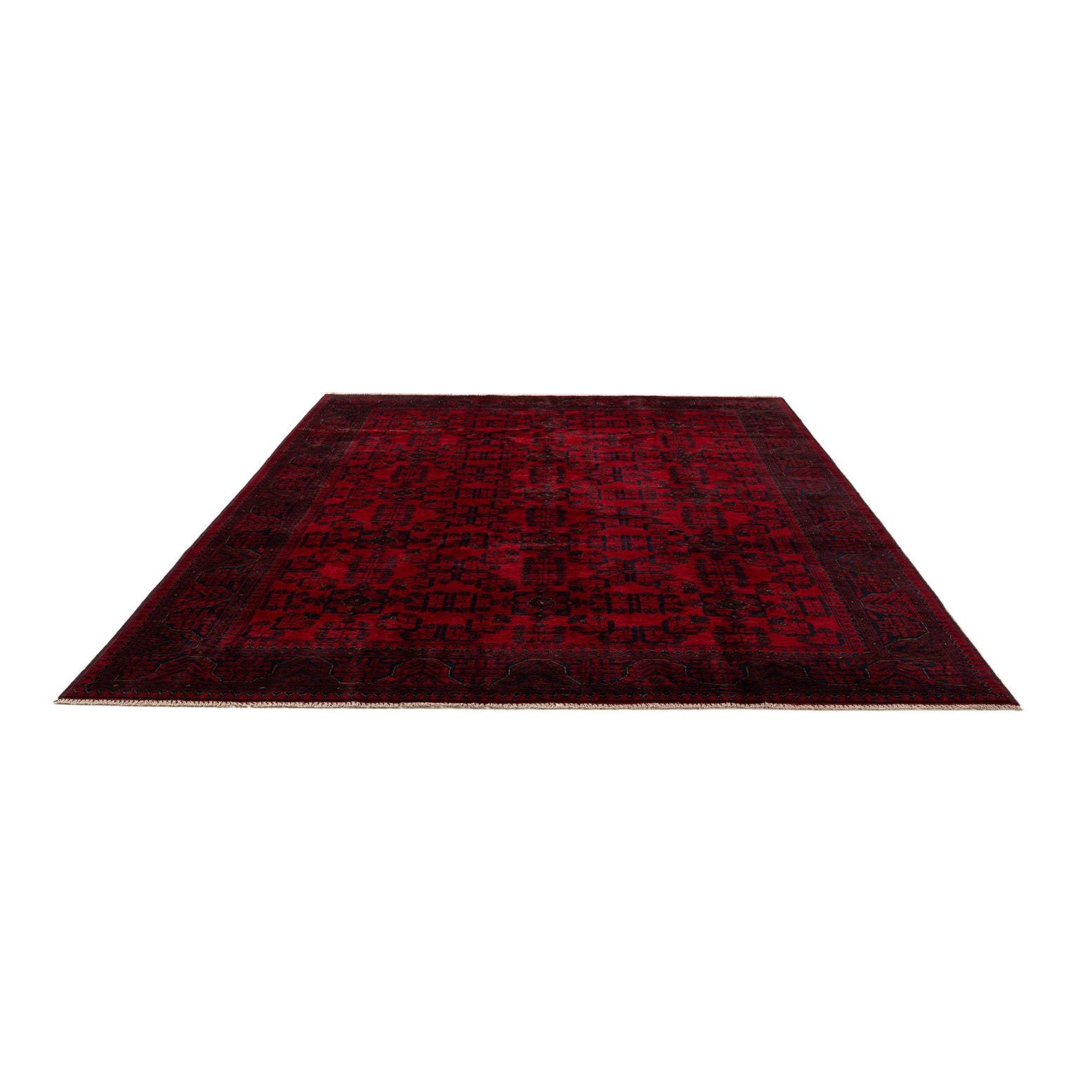 A 7x10 rectangular Khal Mohammadi rug in deep red with intricate dark geometric patterns and a detailed border, suitable for a living room.