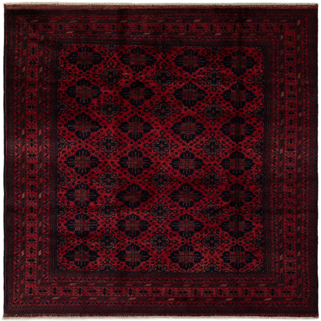 A 7x10 rectangular Rugs.com Khal Mohammadi rug featuring a deep red field with intricate dark blue and black modern patterns and a matching border.