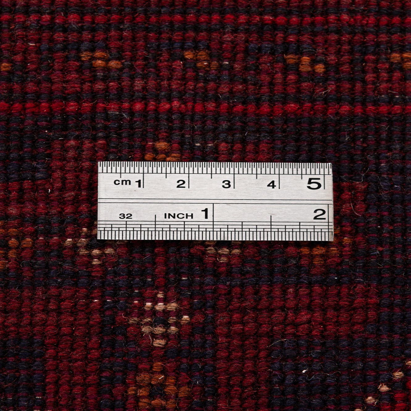 Primary color is Red. Colors in this rug include: Red, Brown, Navy Blue.