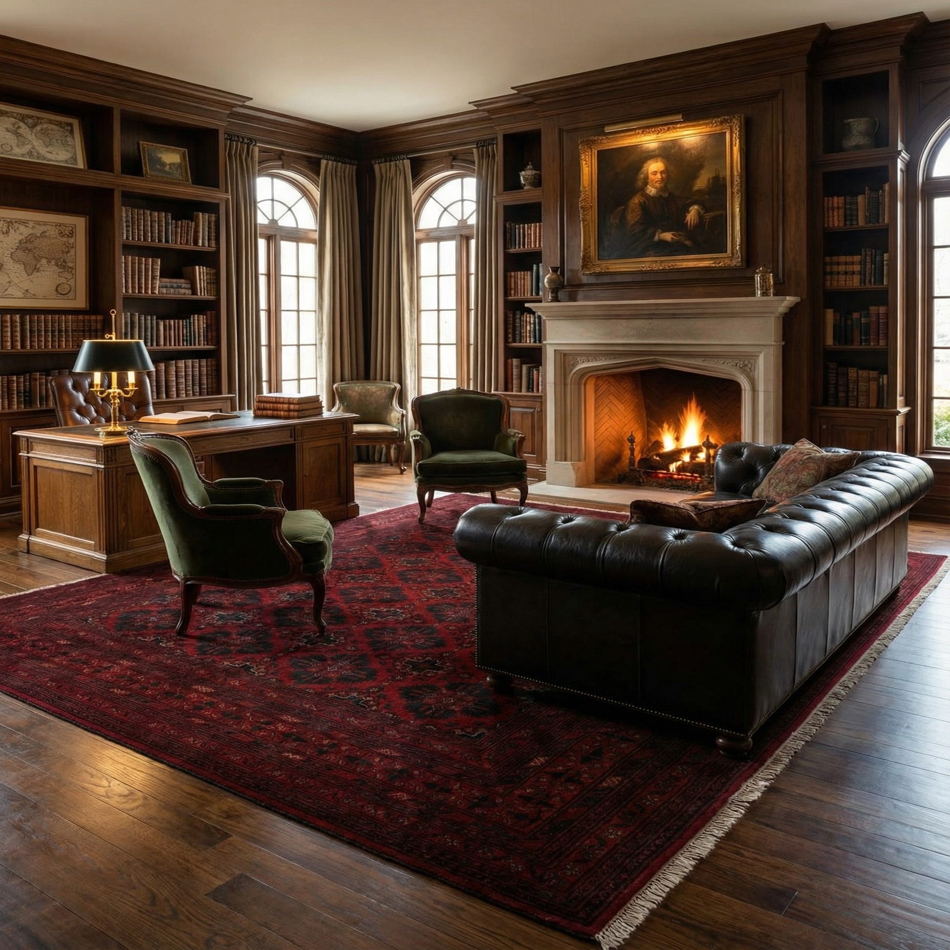A 7x10 rectangular Khal Mohammadi rug in deep reds with a modern geometric pattern, suitable for a living room.
