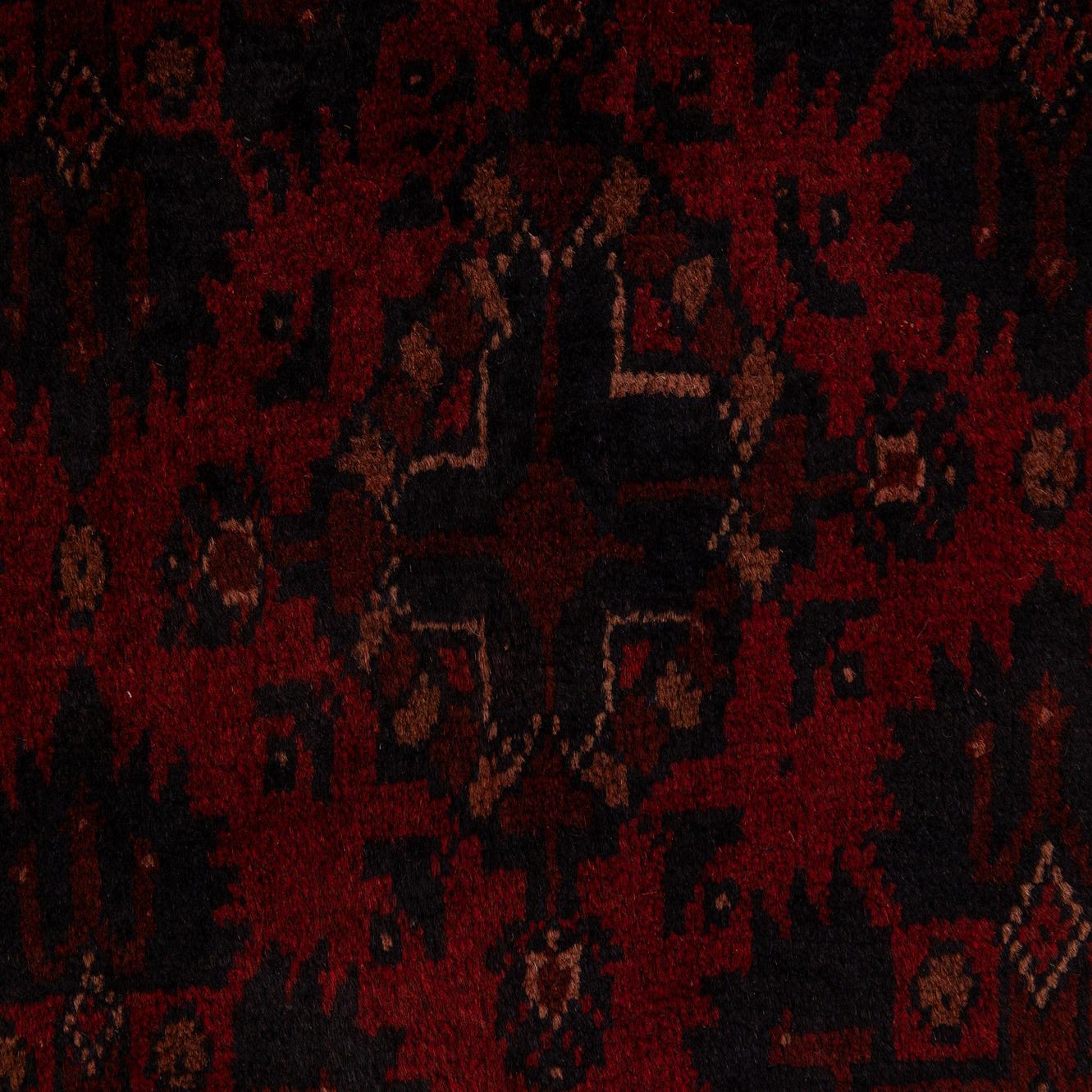 Primary color is Red. Colors in this rug include: Red, Black, Brown.