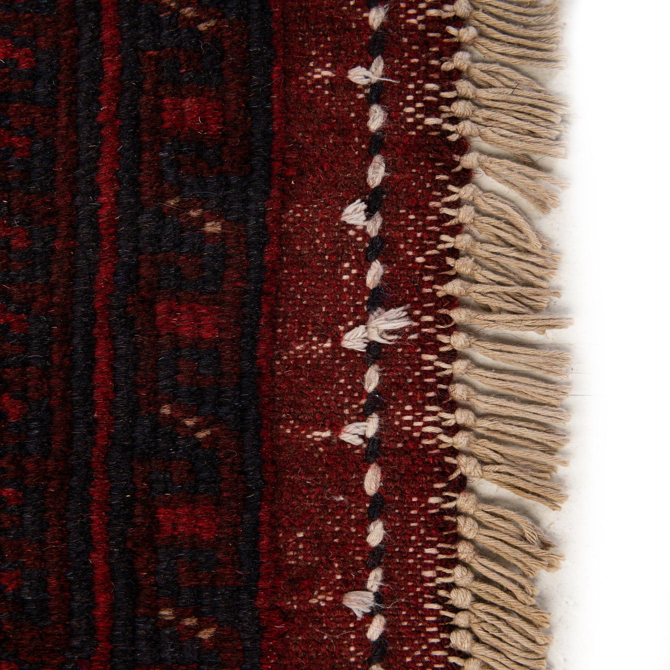 A repeating geometric medallion pattern runs in orderly rows across a deep red field, with rich navy-blue medallions outlined in brown and highlighted with ivory accents. Multiple narrow borders frame the center, each filled with small-scale motifs in brown and navy that create a finely detailed edge. Hand-knotted from 100% wool, the rug has a dense, low-to-medium pile with a soft nap and a subtle woolen sheen; the construction feels substantial and the short fringed ends add a finished, handcrafted touch.