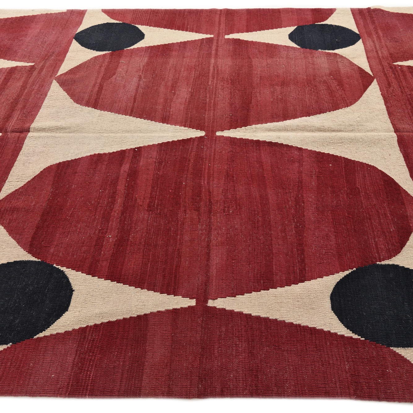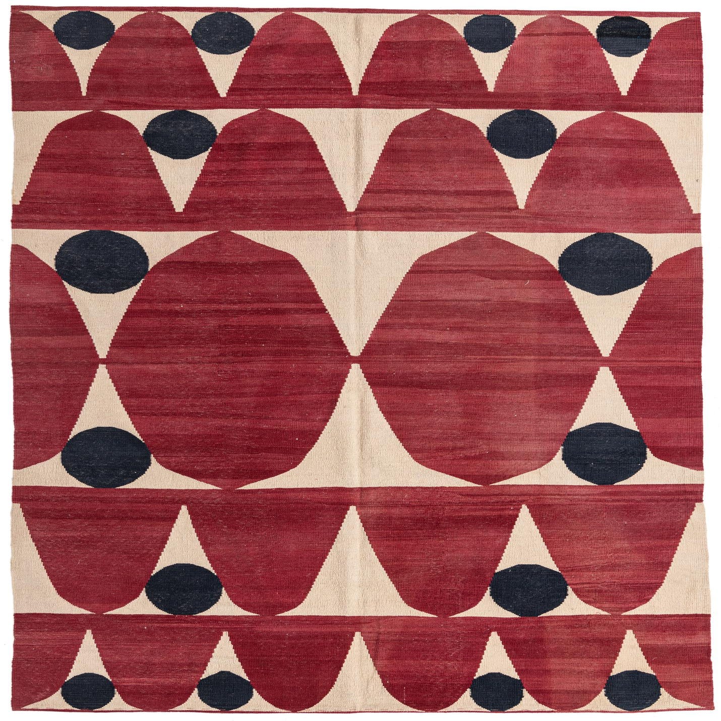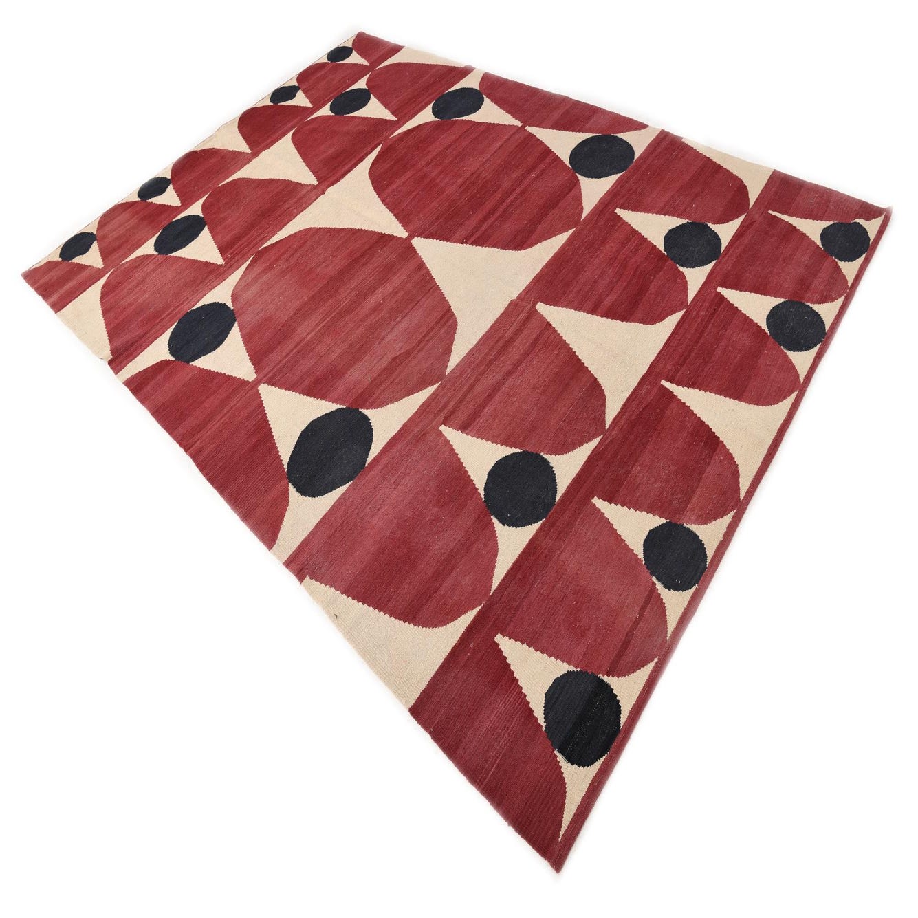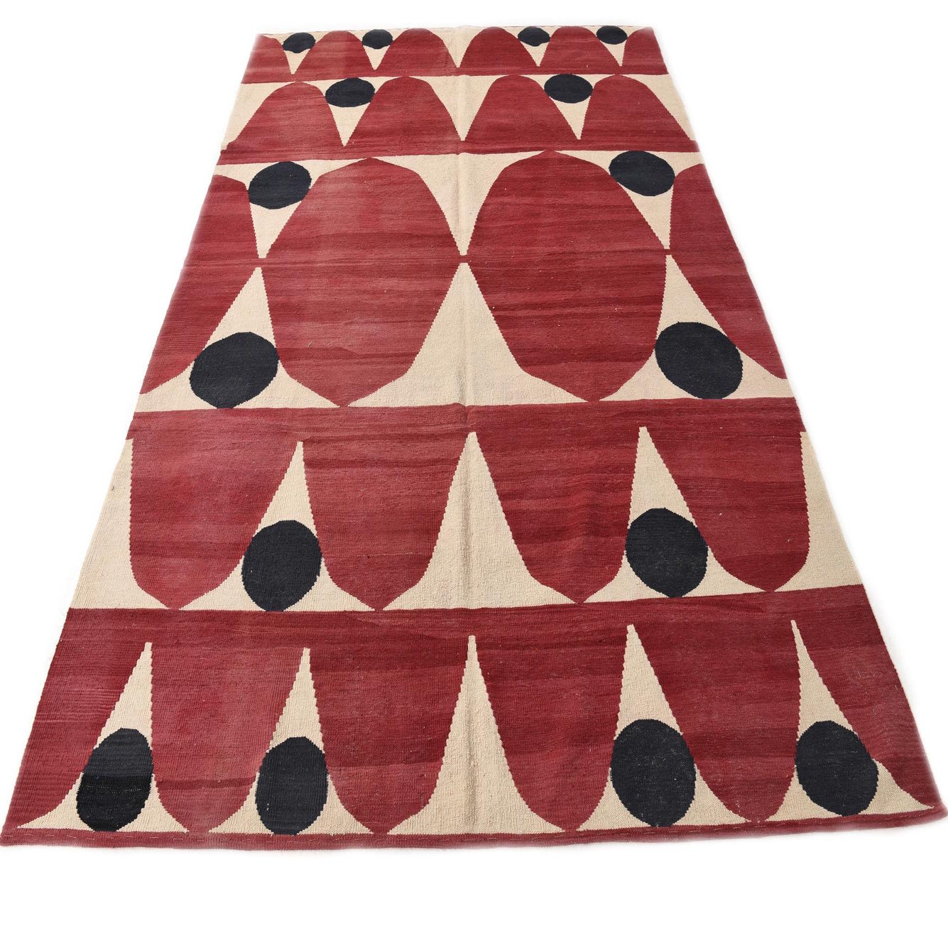 A 7x10 rectangular flatweave rug featuring a bold tribal pattern of red teardrop shapes and black circles on a cream background.