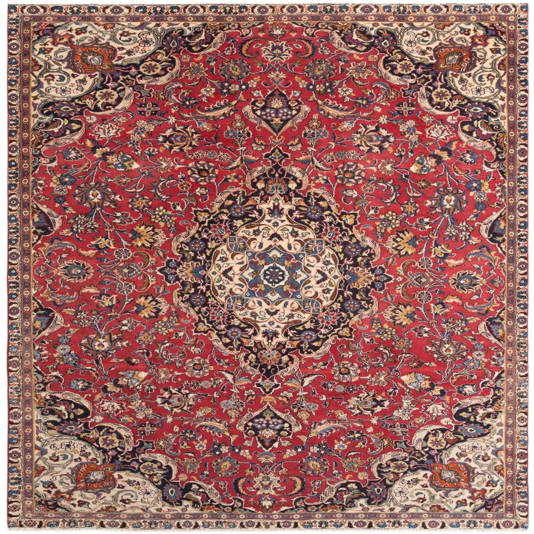 A 7x10 rectangular Mashad rug with a traditional red field, intricate floral patterns, and a central medallion.