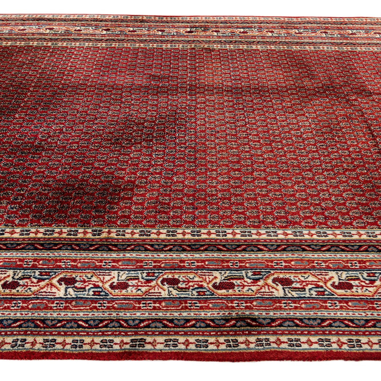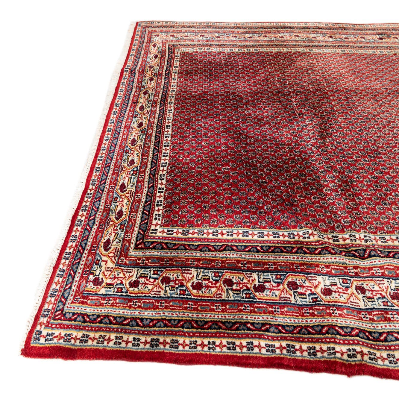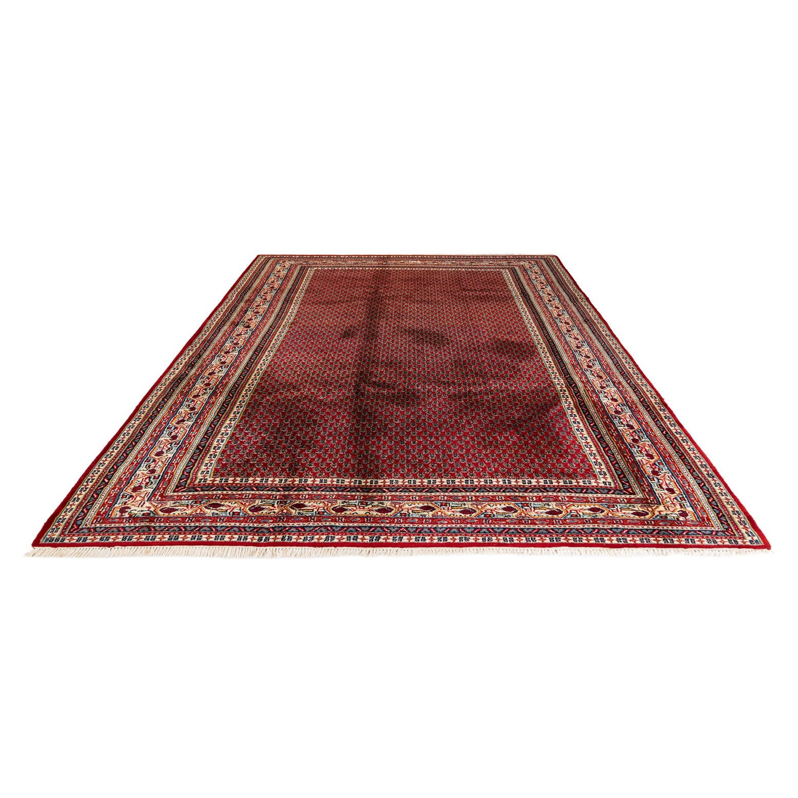 A 7x10 rectangular Mir collection rug in deep red with an intricate traditional Oriental pattern and multi-colored borders.