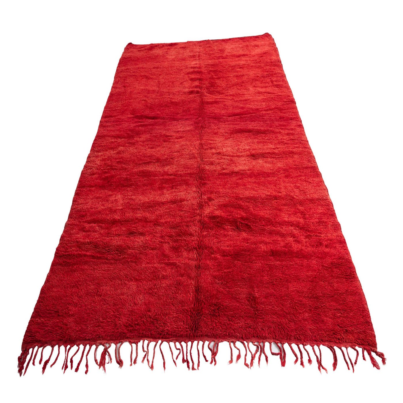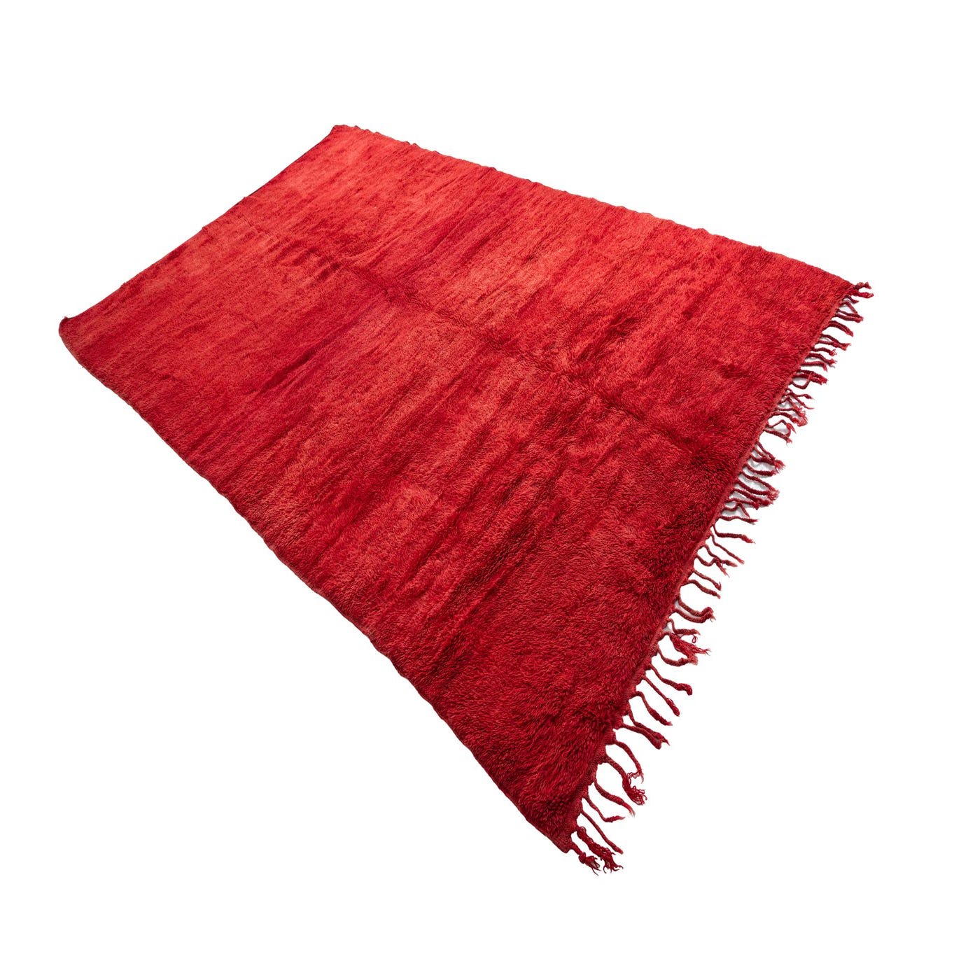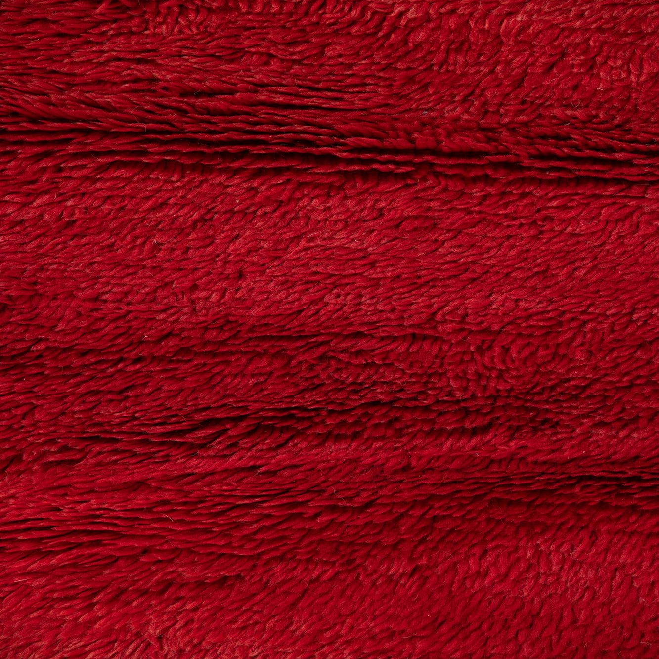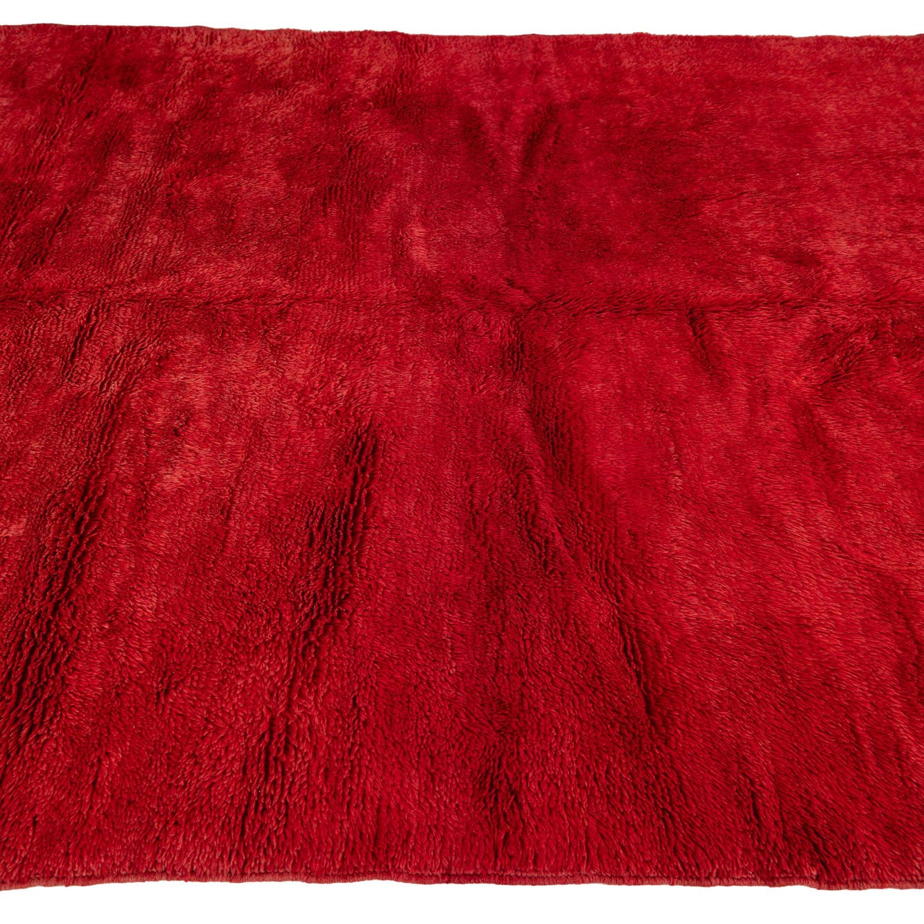 A plush 7x10 rectangular Moroccan shag rug in a vibrant solid red color, handmade from wool.