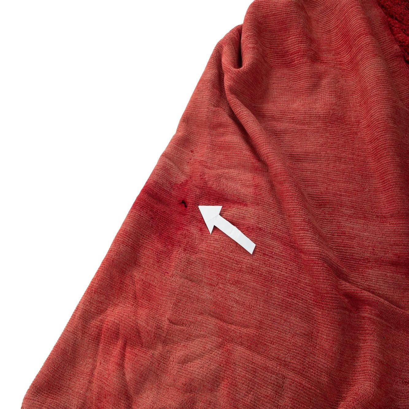 The rug features a notable hole, a testament to its history and extensive use. This patina of age may appeal to collectors and those who appreciate a rug with a story. The rich red hue and traditional fringe make it suitable for an array of interior design scenarios, particularly those incorporating vintage elements or seeking to add a pop of color to monochromatic spaces. This piece could serve as a dramatic focal point in a living room, bedroom, or dining area, complementing dark wood furniture, earthy decor, and both contemporary and traditional settings.