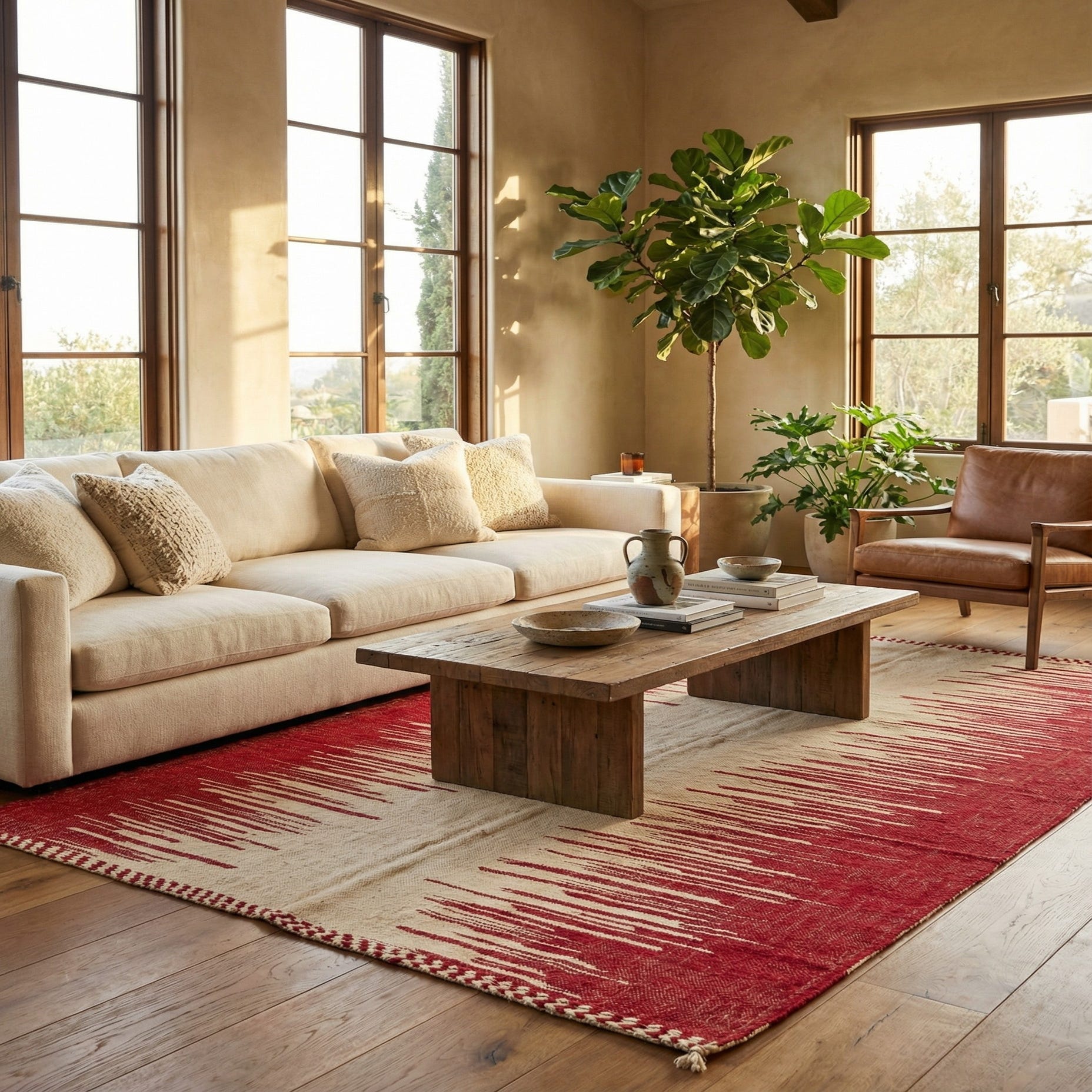 A 7x10 rectangular red and cream tribal shag rug with an abstract pattern, ideal for a living room.