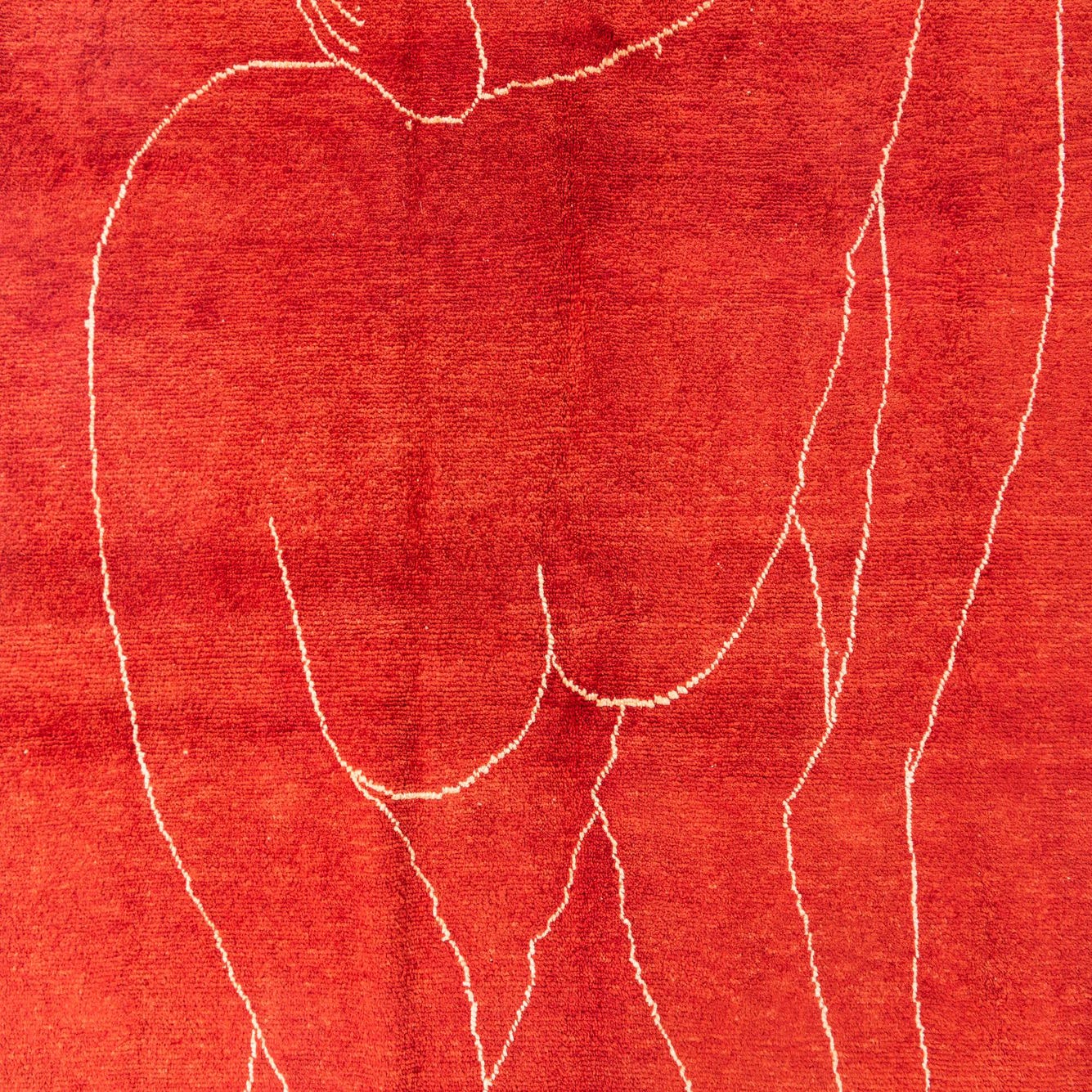 7x10 rectangular red shag rug with an abstract tribal design depicting intertwined figures in cream and blue.