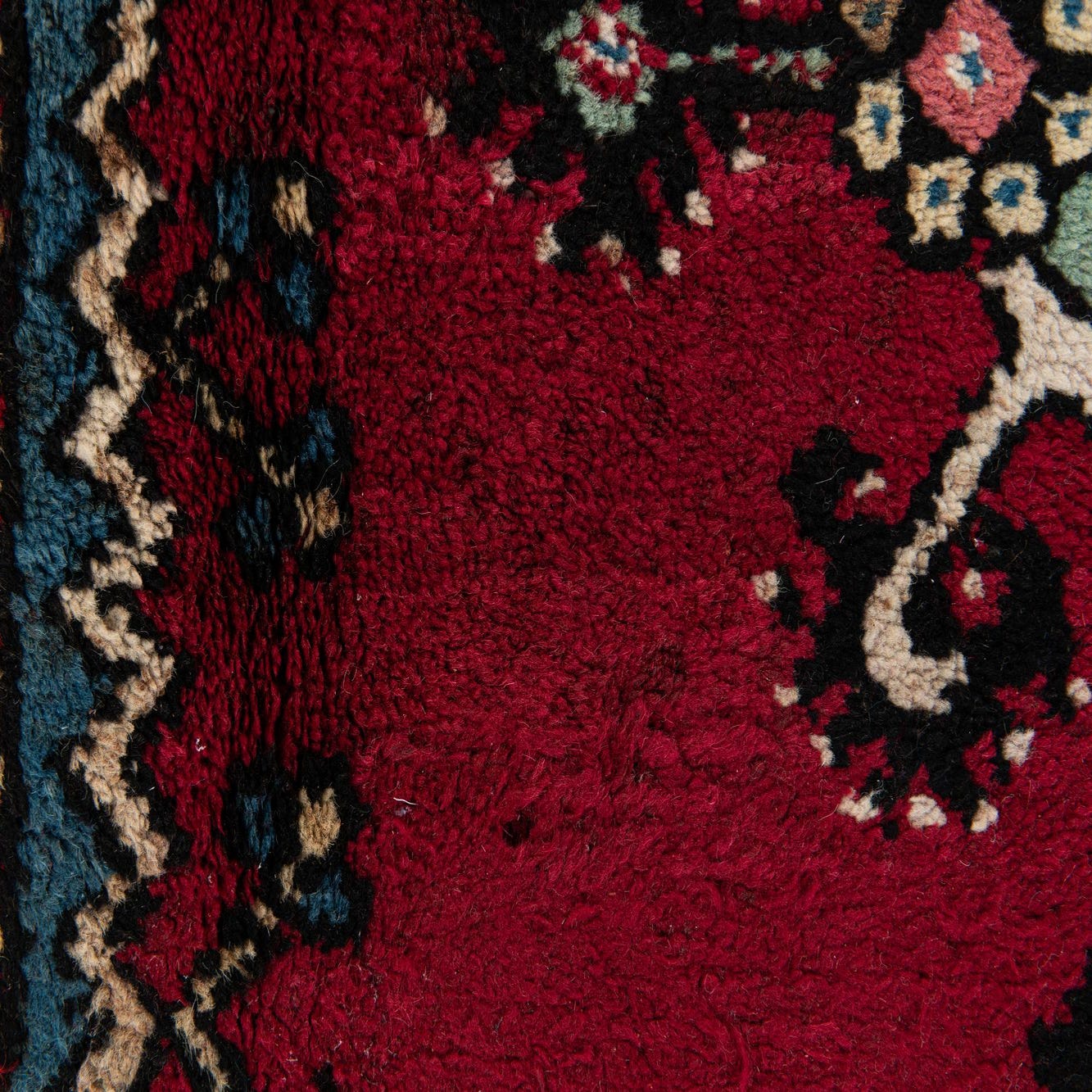 A 7x10 rectangular Moroccan shag rug in deep reds and blues with a central medallion and intricate tribal patterns, featuring white fringe.