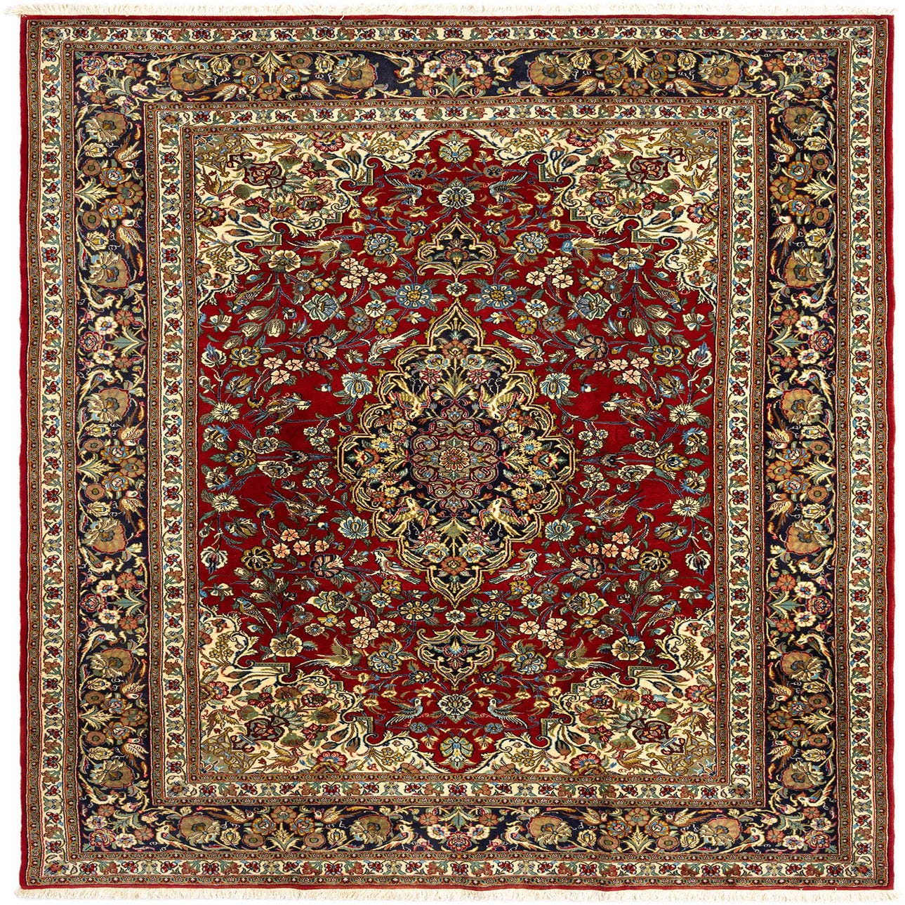 The Ghom Collection presents a 7x10 hand-made wool rug that features a rich red background, accentuated by a luxurious array of colors including navy, gold, teal, and ivory. The intricate pattern boasts a dense central medallion surrounded by floral motifs and curling leaves, which is framed by an equally elaborate border that creates a well-defined edge to the design.