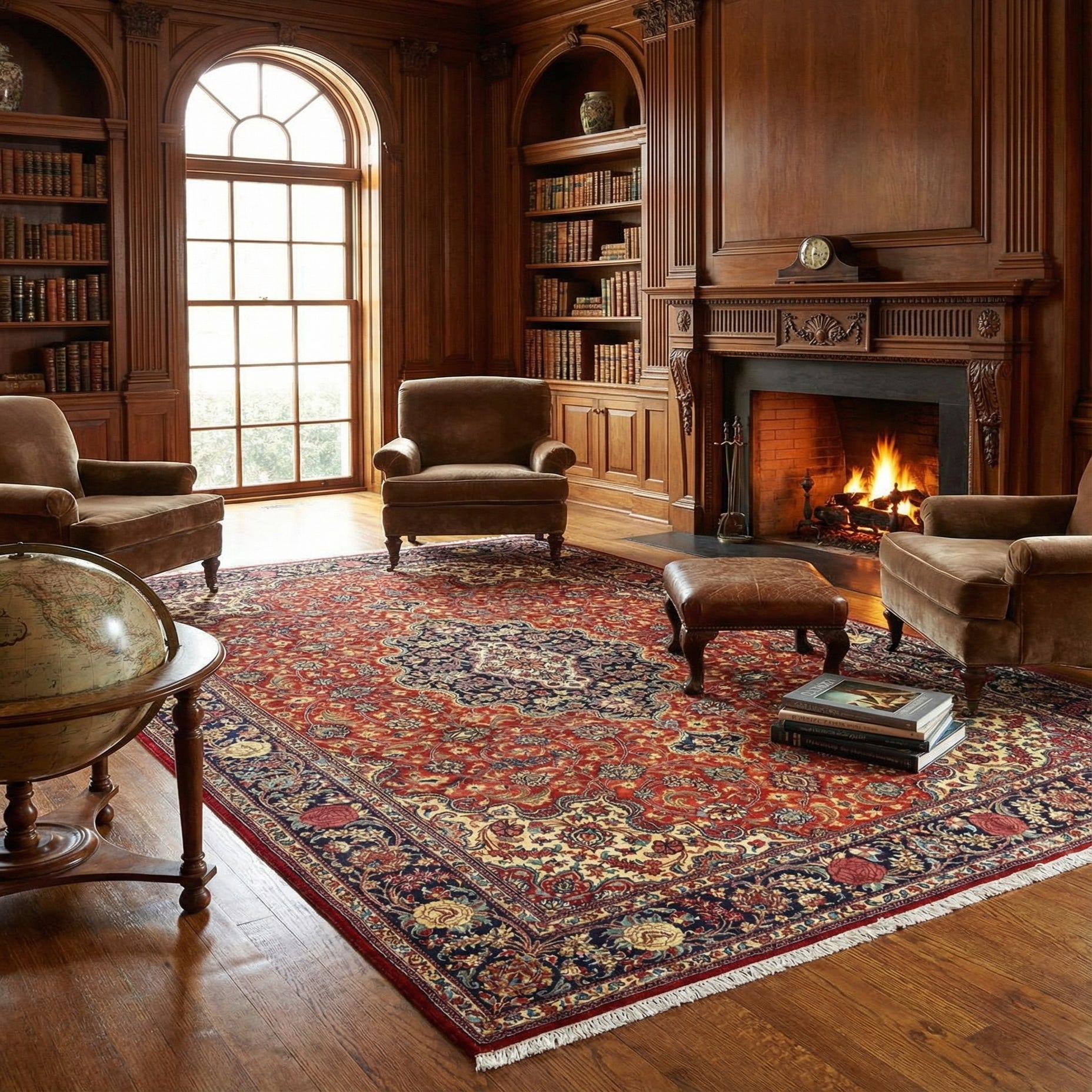 The texture of the high-quality wool is pleasing to the touch, while the rug's density and weave provide a resilient surface suitable for high-traffic areas. The rug's traditional design makes it a timeless addition to any room, effortlessly complementing classic and sophisticated decor. This rug would thrive in spaces such as a formal living room, dining room, or study, bringing warmth and character to wooden or stone flooring, alongside darker furniture to highlight its rich color scheme.
