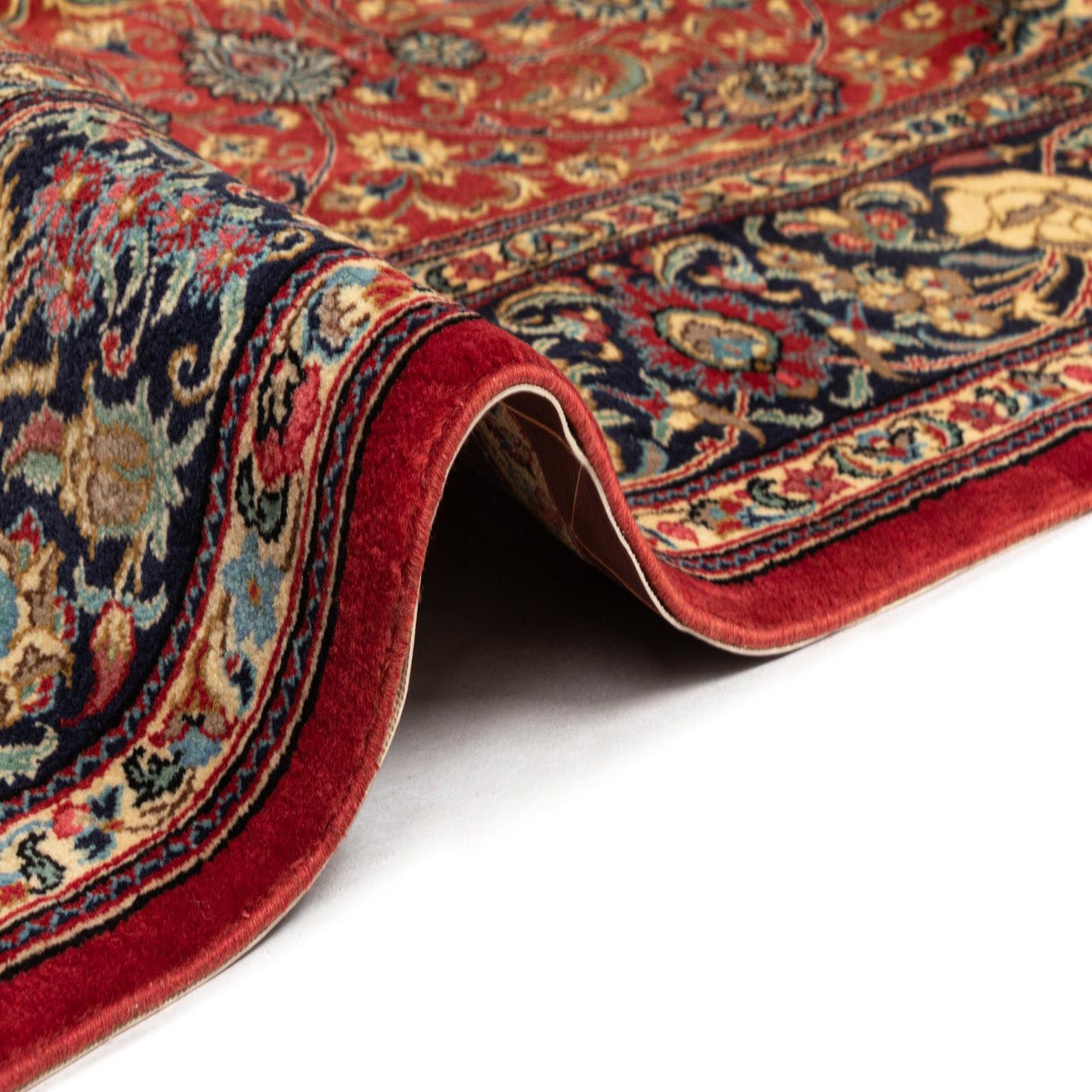 The Ghom collection offers a hand-made wool rug in a generous 7x10 size, designed to anchor and enhance a variety of spaces. This piece displays a vibrant red background, adorned with intricate patterns and a complex border in a harmonious palette including shades of navy, gold, and ivory. Florals and ornamental motifs are masterfully dispersed throughout the design, creating a sense of depth and luxuriousness.