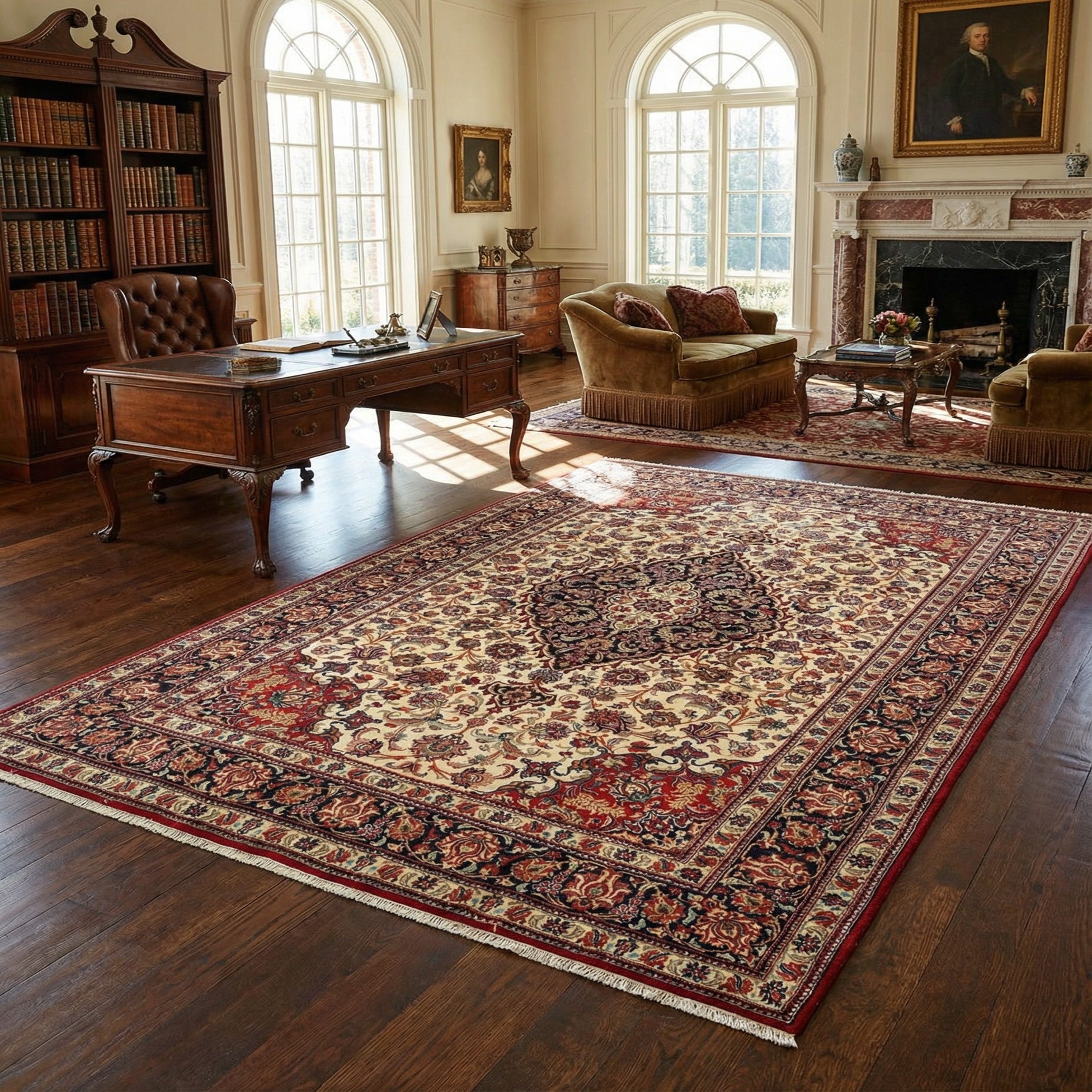 This rug can elevate the elegance in a variety of interior settings. It is an exceptional choice for formal living rooms or dining areas where it can serve as a focal point, complementing rich wood finishes and classic furnishings. Alternatively, it can add a touch of sophistication to more casual spaces, blending seamlessly with a plush sofa set and accenting hardwood or tiled floors with its warmth and depth of color. This rug would integrate well with both traditional decor themes and contemporary spaces that embrace classic elements.