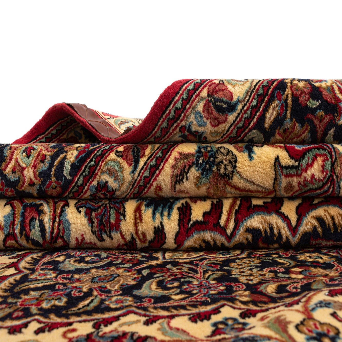 The Ghom collection offers a 7x10 hand-made wool rug that features a refined traditional design, which harmoniously integrates a central medallion with intricate floral motifs spreading across its field. The rich red background serves as a bold canvas, accentuating the elaborate patterning detailed in hues of navy, beige, and bursts of complementary reds and blues. A pronounced border frames the design, showcasing further complexity with its layered patterns and symmetry.