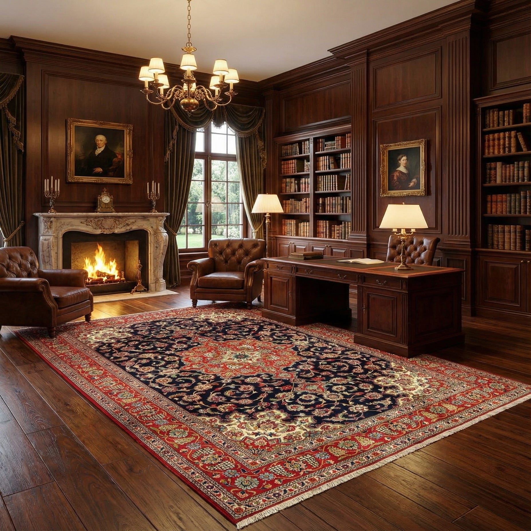 Hand-knotted in wool, the pile has a substantial yet supple hand — you can feel the density and the slight, natural luster of wool underfoot. The pattern and colorway work well in formal living or dining rooms, a home library or study, and also pair nicely with transitional interiors where classic detailing meets clean-lined furniture. For contrast, try it with warm wood tones and leather, or layer it beneath a neutral sofa to make the pattern the room’s focal point.