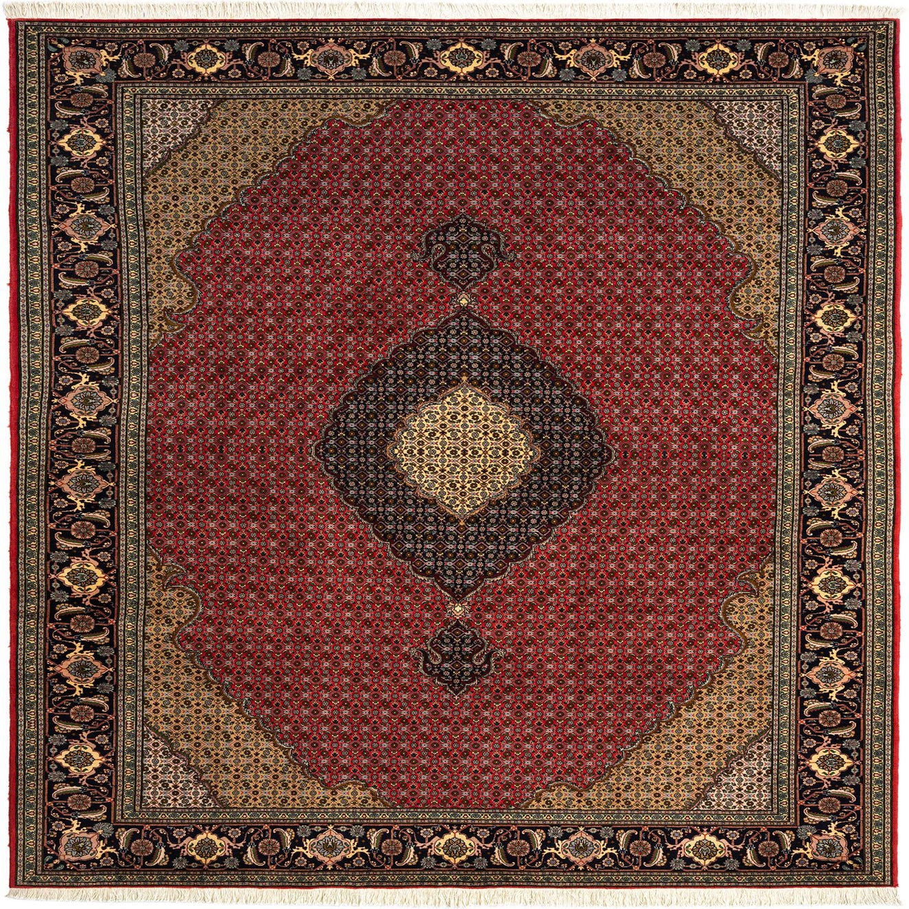 A 7x10 rectangular Tabriz Mahi Persian rug with a rich red field, intricate floral patterns, and a central medallion in gold and black, surrounded by a detailed border.