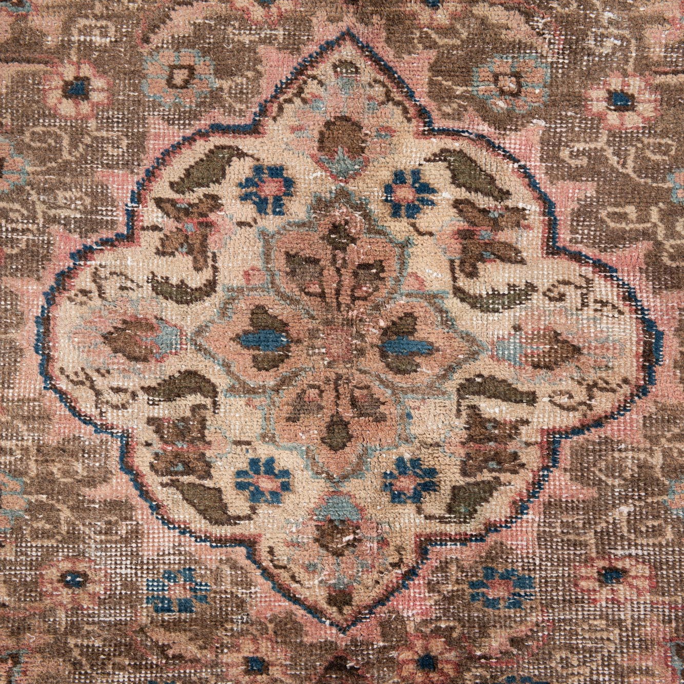 A Persian-inspired medallion anchors this hand-knotted 100% wool rug, set on a warm red ground and detailed with an aged, vintage look. The central brown-and-ivory medallion is surrounded by scrolling floral vines in navy and lighter blue, with brown palmettes and ivory accents tracing the borders. The distressed finish softens the contrasts, giving the pattern a lived-in, layered quality that balances classic ornament with a relaxed aesthetic.