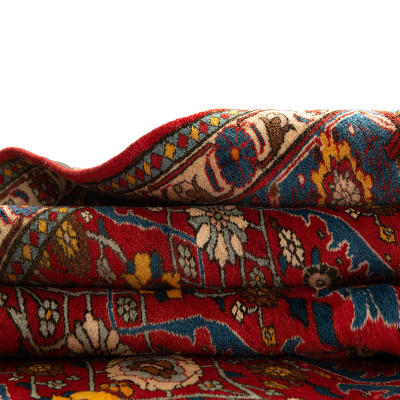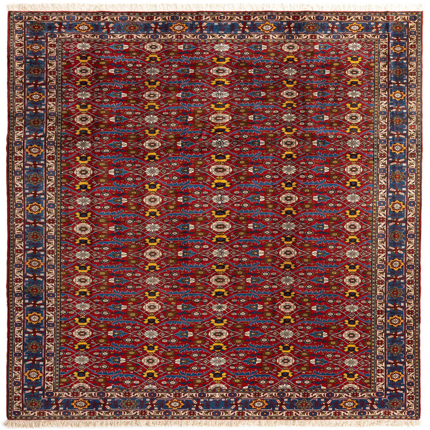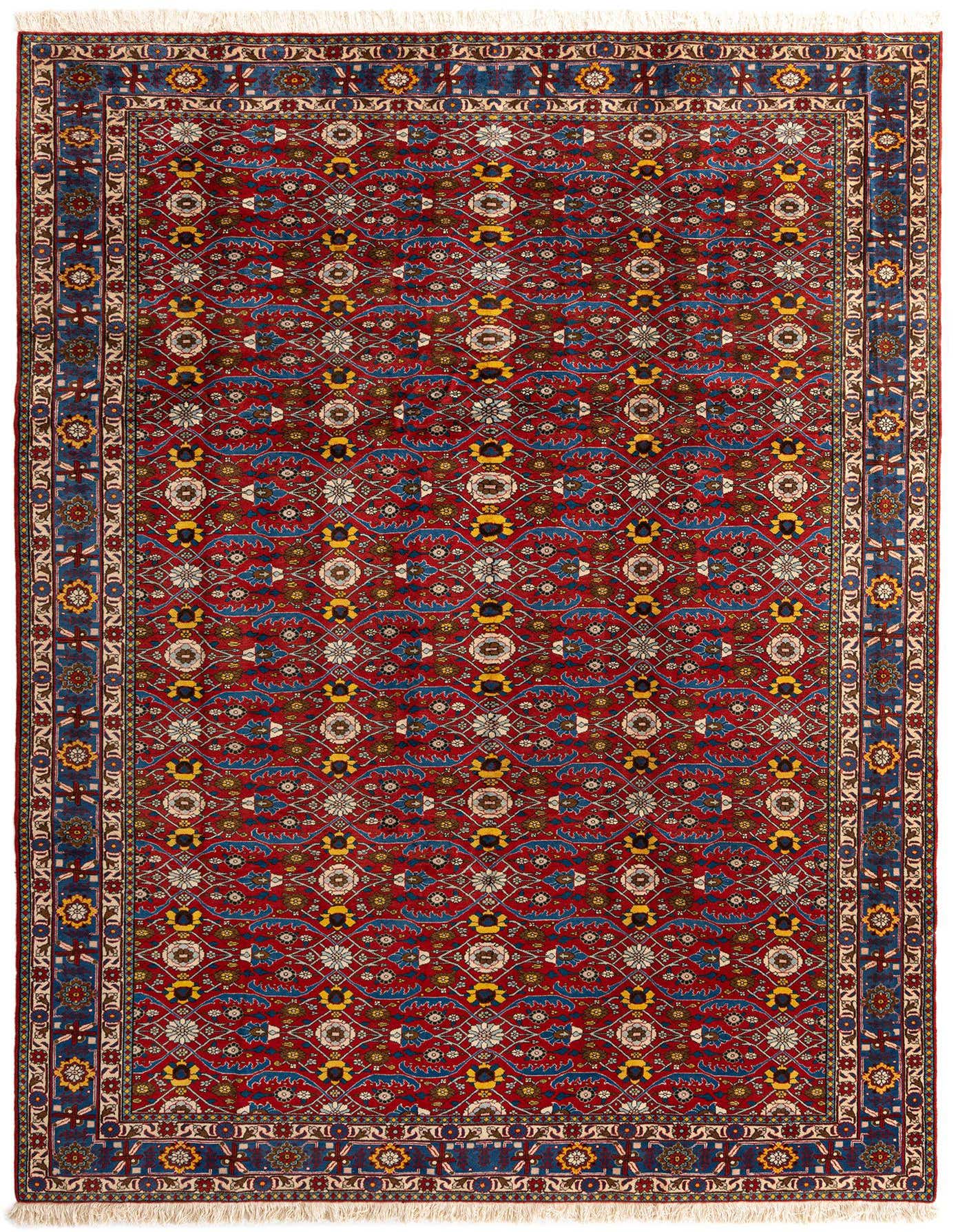 Primary color is Red. Colors in this rug include: Red, Red, Blue, Cr?me, Brown, Yellow.