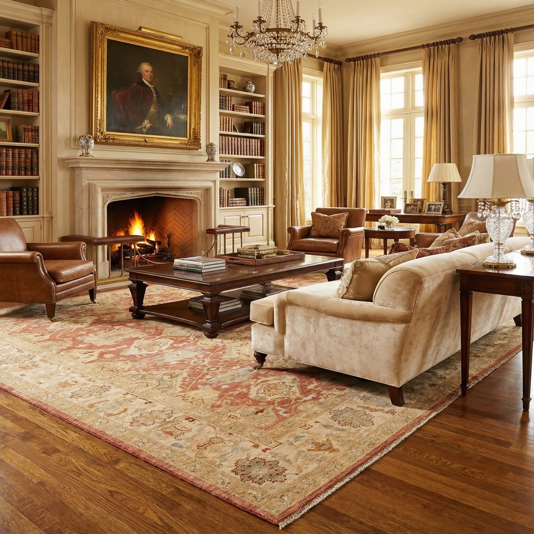 This rug's palette and classic design offer versatility for a range of interior settings. It would sit comfortably in a traditional space against rich wood tones, accentuating the historic charm of the room. Alternatively, the rug's warm red hues and ornate pattern can add depth and character to a more contemporary or minimalist decor, providing a focal point that bridges modern aesthetics with classic elements. In transitional interiors, this rug can serve as a harmonious balance between old and new, making it suitable for an array of home styles.