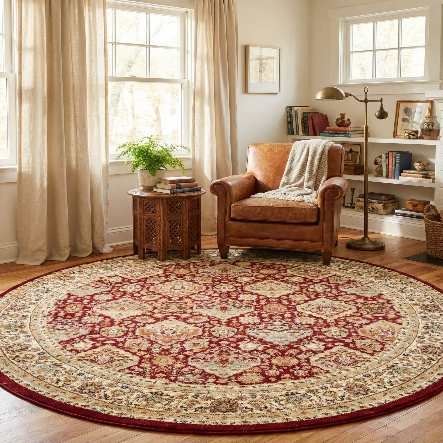 This round shape is ideal for anchoring a seating group or centering a dining table, and its traditional palette pairs naturally with warm wood furniture, leather or neutral upholstery, and brass or antique accents. Use it in a formal living room or dining room to reinforce a classic scheme, or combine it with clean-lined contemporary furnishings to create a balanced, transitional space.