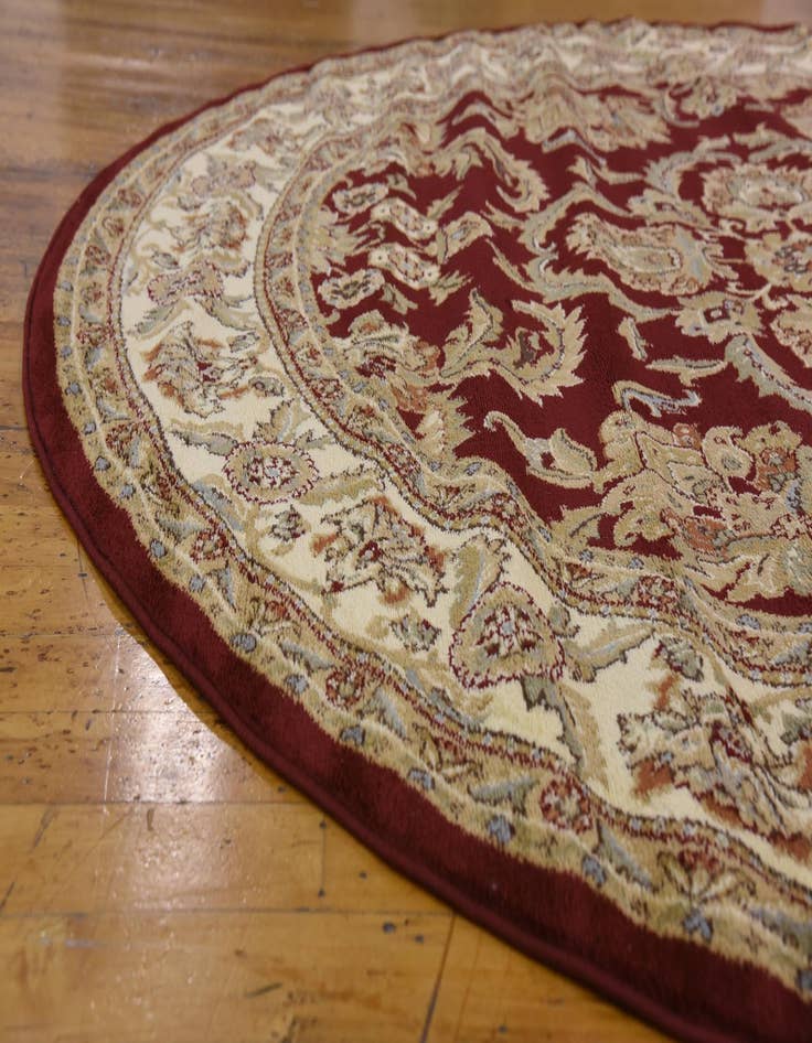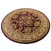A deep red field sets a warm tone for this round rug, centered on a classic medallion of scrolling floral and foliate motifs in cream, tan and peach. The wide cream border is filled with repeating rosettes, vines and tiny floral sprays outlined in brown and accented with touches of blue and green, giving the design a layered, refined look. Machine-made from 100% polypropylene, the rug has a low-profile pile that feels smooth underfoot and keeps the intricate pattern crisp and well-defined.