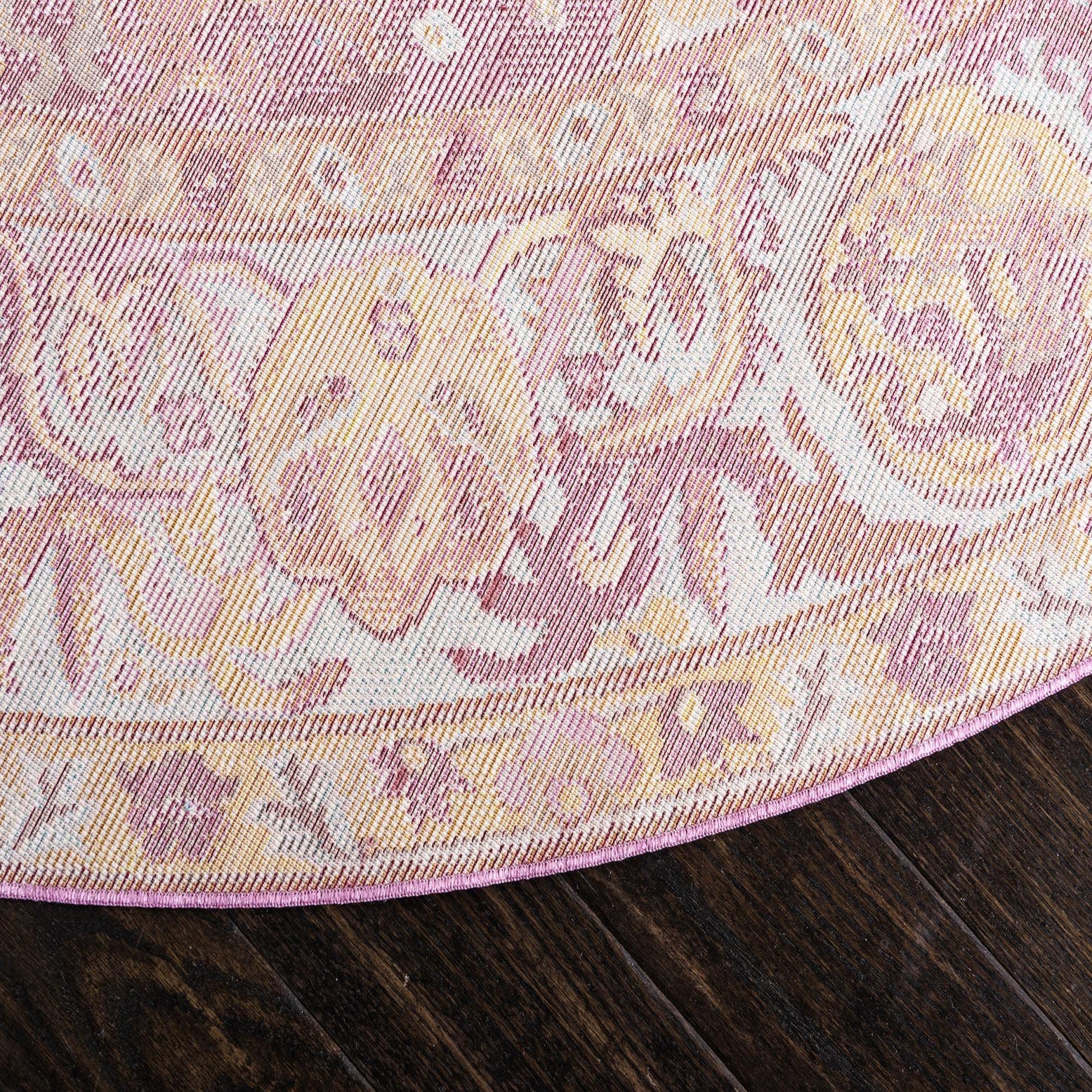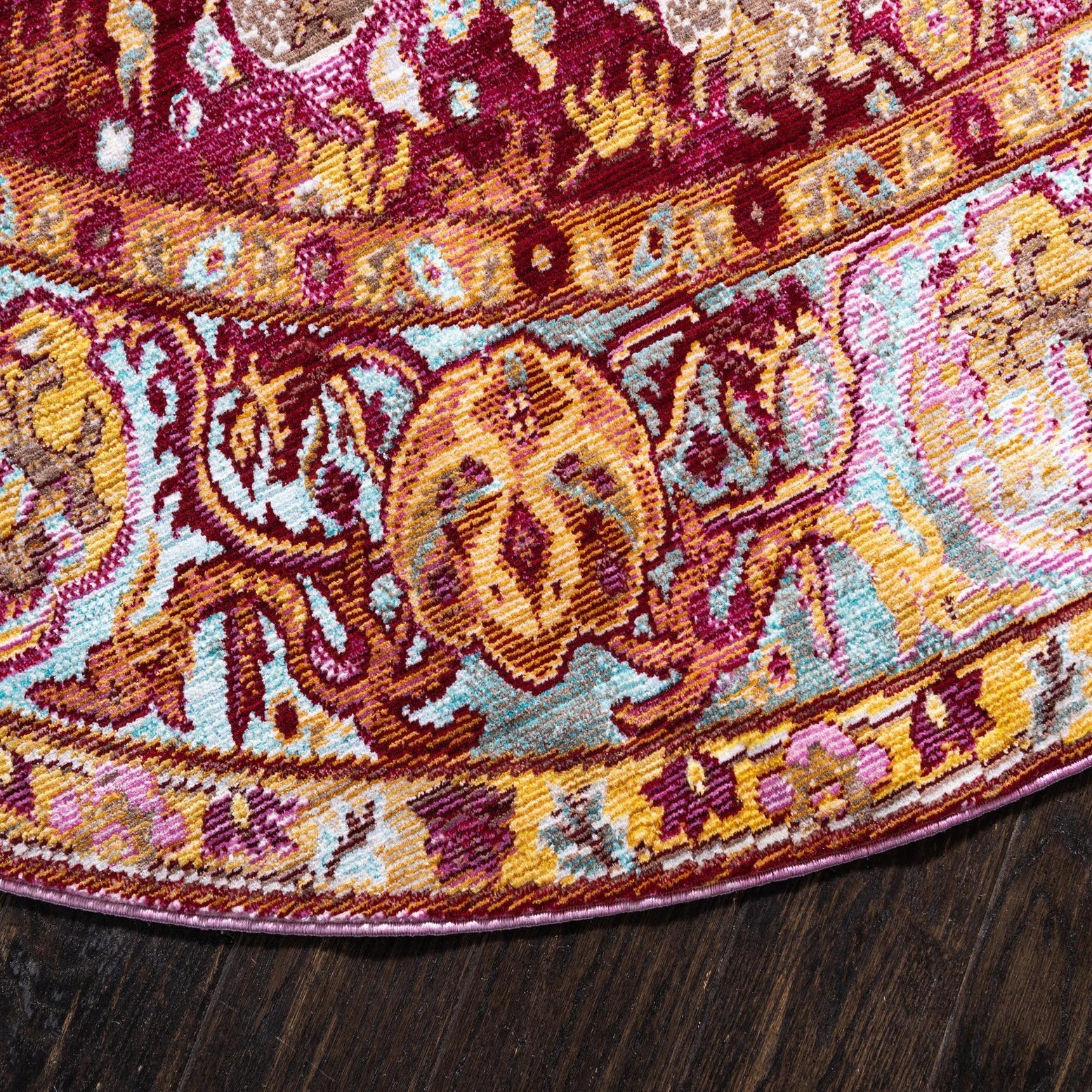 The round shape makes this rug well suited to anchor a cozy seating group, round dining table, or a bedroom sitting nook. It pairs nicely with warm wood finishes and brass or antique metal accents, and will complement both traditional and eclectic interiors—use it to add color to a neutral sofa arrangement or to harmonize with jewel-toned upholstery for a layered look.