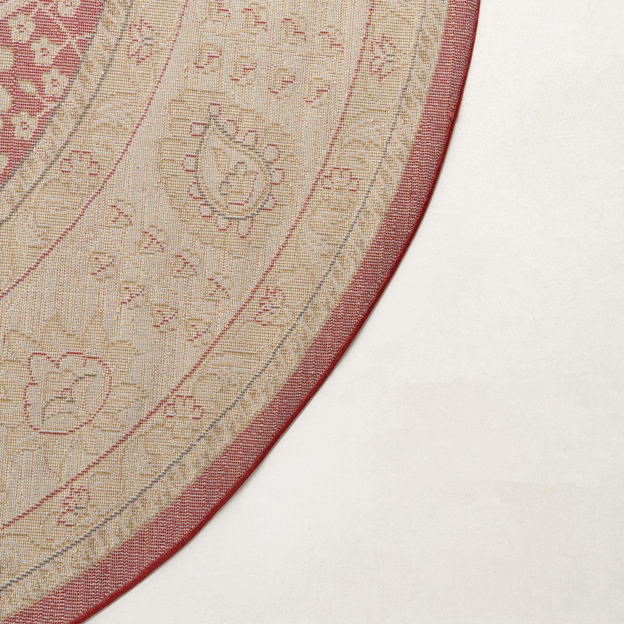 The Chelsea collection presents a sophisticated 8 Ft Round rug, machine-woven of 100% polypropylene, ensuring durability and ease of maintenance. The rug features a vibrant red background complemented by a harmonious mix of beige, cream, light brown, and light green hues. Its intricate pattern showcases traditional motifs, including floral medallions and ornate borders, which provide a sense of timeless elegance to any space.