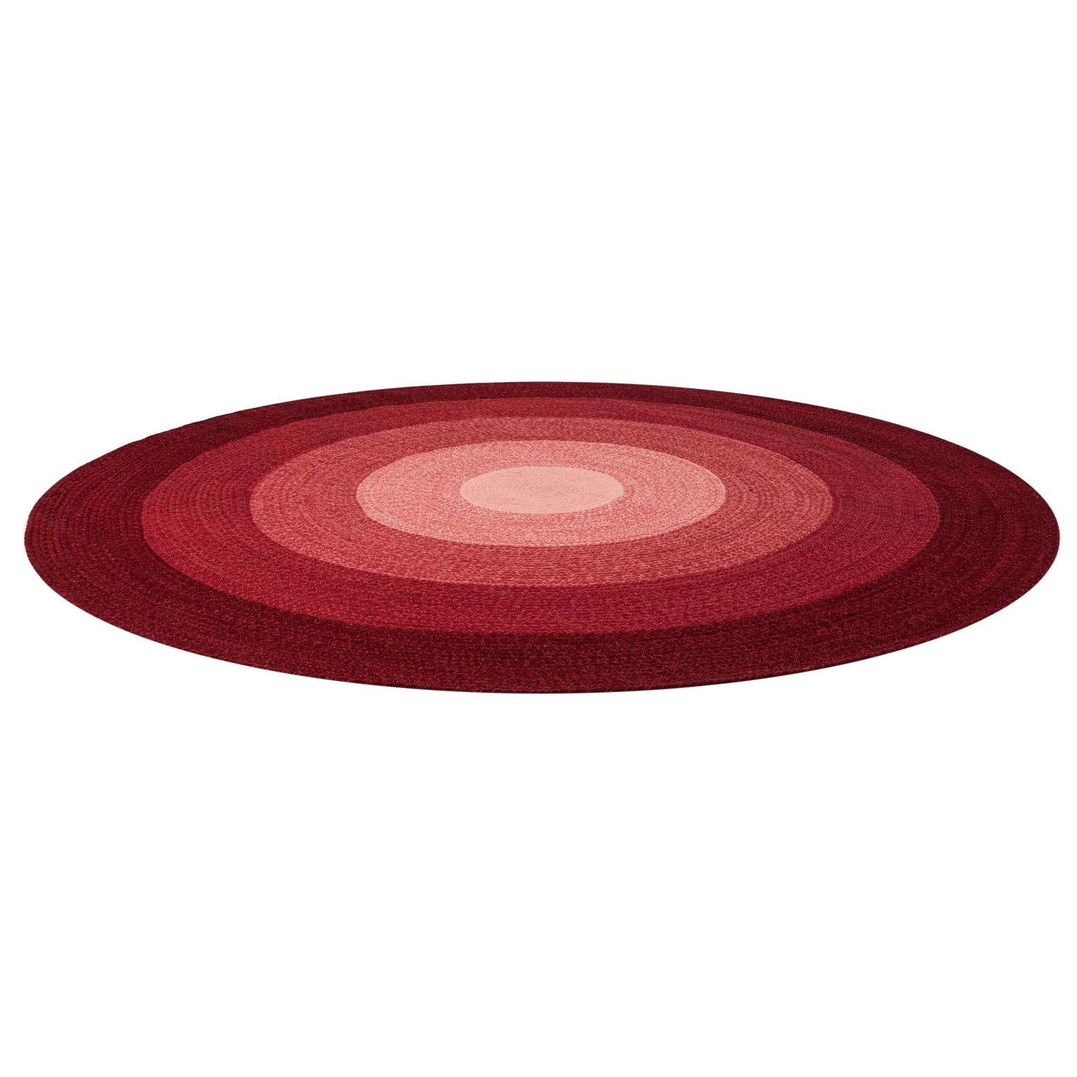 A round, hand-braided wool rug featuring concentric circles in varying shades of red, from light to deep crimson.