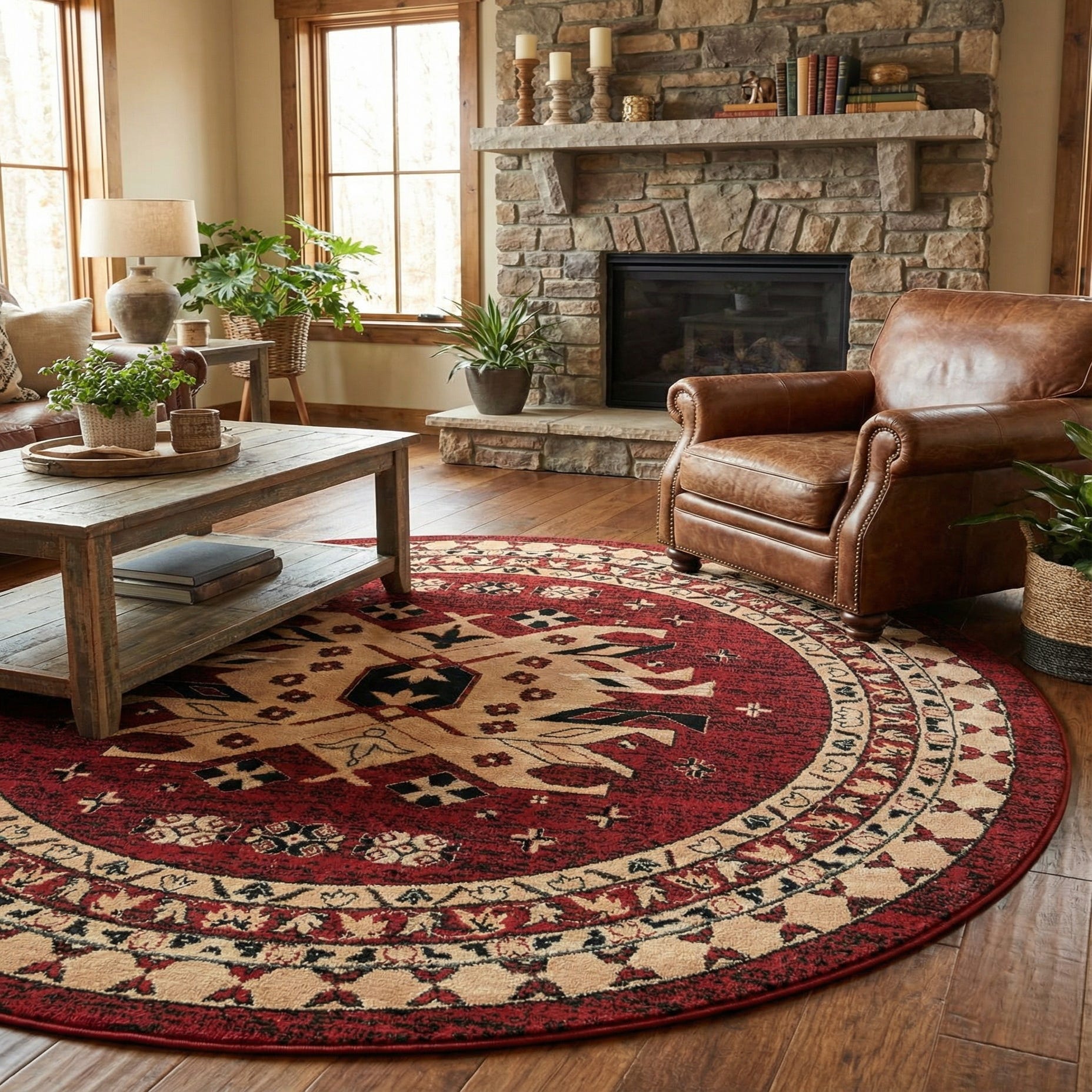 The warm red background and cream, brown and black accents pair well with walnut or mahogany woods, leather seating, or neutral upholstery. Use it beneath a round dining table, in an entryway or foyer to set the tone, or beneath a small seating arrangement to add color and structure. Its traditional, geometric character fits classic interiors and also adds grounded warmth when mixed into eclectic or bohemian schemes.