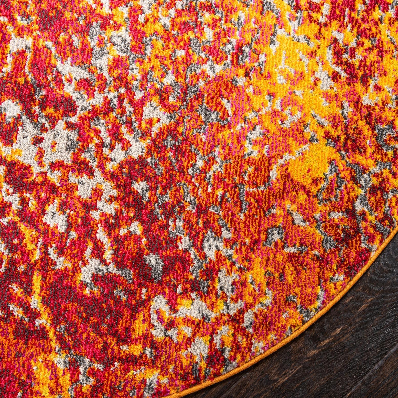 A bold, round area rug with a layered, abstract pattern anchored by a red background and alive with flecks of orange, yellow, puce and pink. Cream, beige, brown and gray accents thread through the field, creating a speckled, painterly effect that moves across the surface in warm, diffused zones. The composition has a gently distressed feel that adds visual depth without raised motifs. Machine made of 100% polypropylene, the rug has a low, dense pile that feels smooth to the touch and slightly cushioned underfoot.