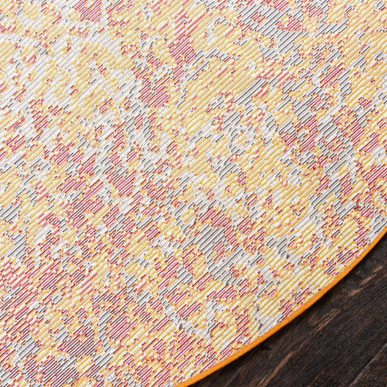 Place this rug beneath a round dining table to emphasize shape, or center it in a living room to ground a seating grouping with warm color. It pairs naturally with warm wood finishes and leather for a mid-century modern look, or with layered textiles and eclectic art for a bohemian or contemporary scheme. The round form also works well in an entry, a sunroom, or a cozy reading nook where the lively palette brings energy and warmth.