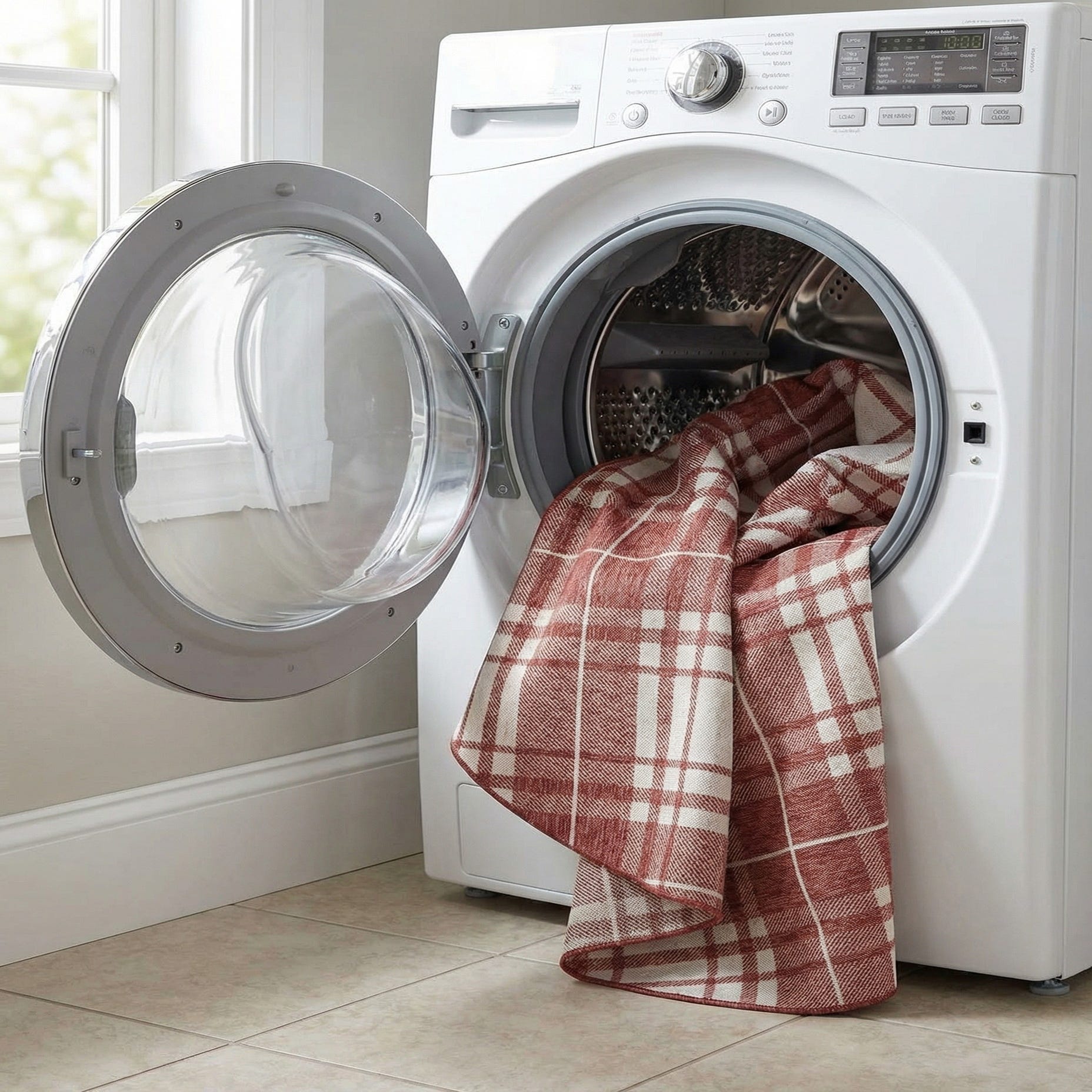 A timeless checkered plaid in warm red and ivory creates a clean, structured look that feels both classic and casual. The pattern arranges crisp ivory grid lines over a red field, with subtle crosshatch shading that adds visual texture without overwhelming the design. Machine-made from 100% polypropylene, the rug has a low-profile, tightly woven surface that offers a slightly textured hand and a firm, stable feel underfoot.