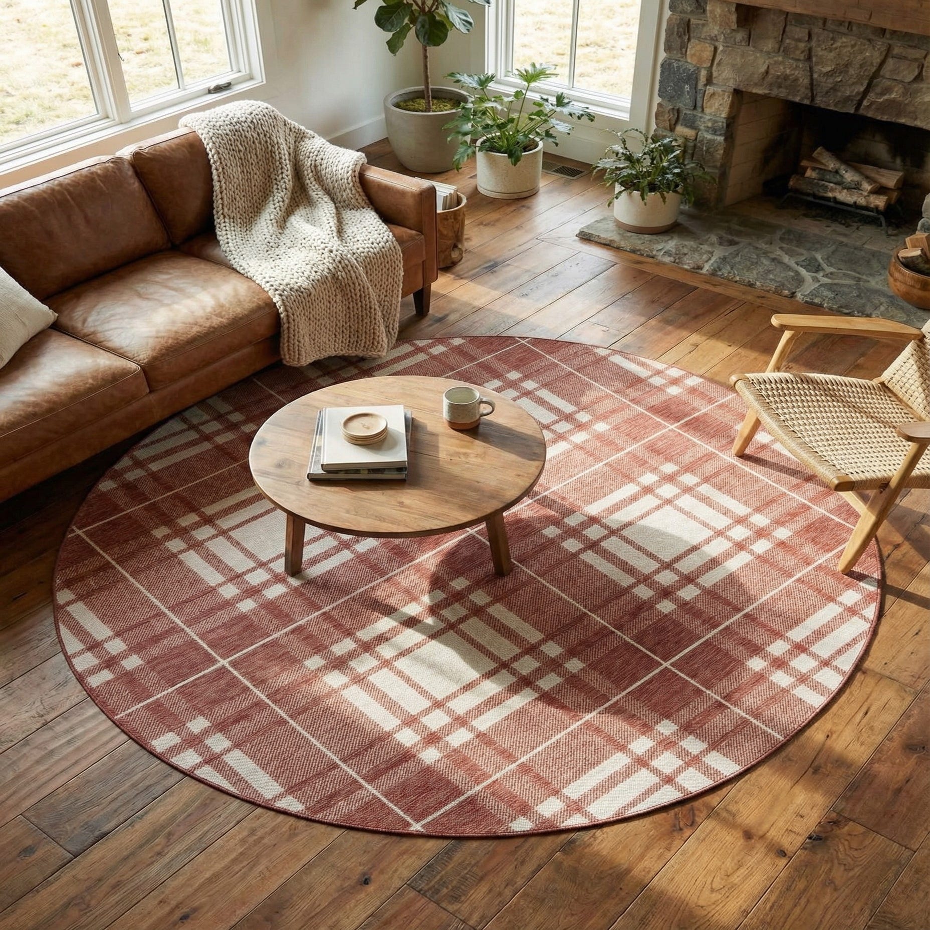 A 7' 10 x 7' 10 round red and white checkered rug, suitable for indoor or outdoor use on a patio.
