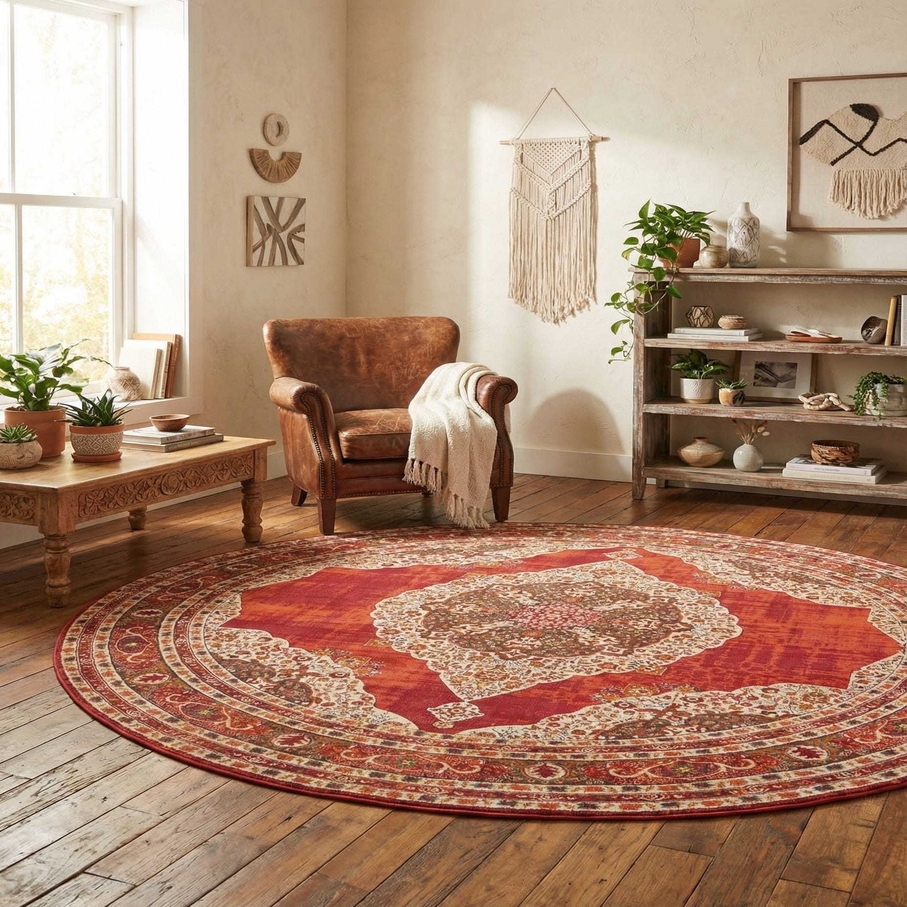 The round shape provides a natural anchor for a round dining table or a conversational seating group, while the warm reds and terracotta tones pair beautifully with natural wood finishes and leather seating. Use it to add color and pattern to a traditional living room, to warm a transitional entry, or to complement a bohemian-styled space with plants and layered textiles—the rug’s palette and medallion focal point work well with both neutral and richly hued furnishings.