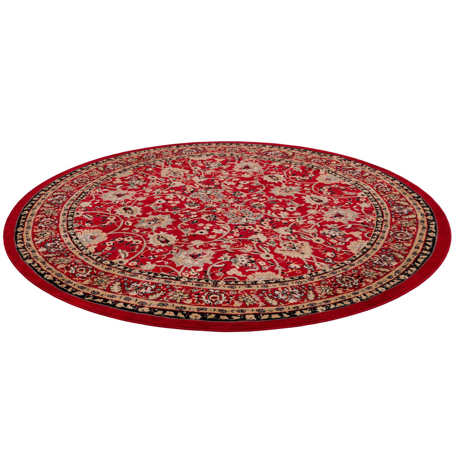 The Yasmin Collection offers a machine-woven 8 Ft round rug crafted from 100% polypropylene, combining durability with refined visual appeal. The rug presents a rich red background, elegantly contrasted with accents of cream, tan, black, and gray, creating a vibrant yet harmonious color palette.