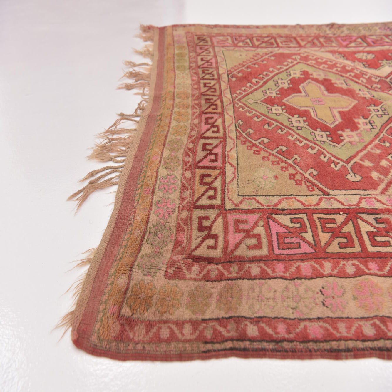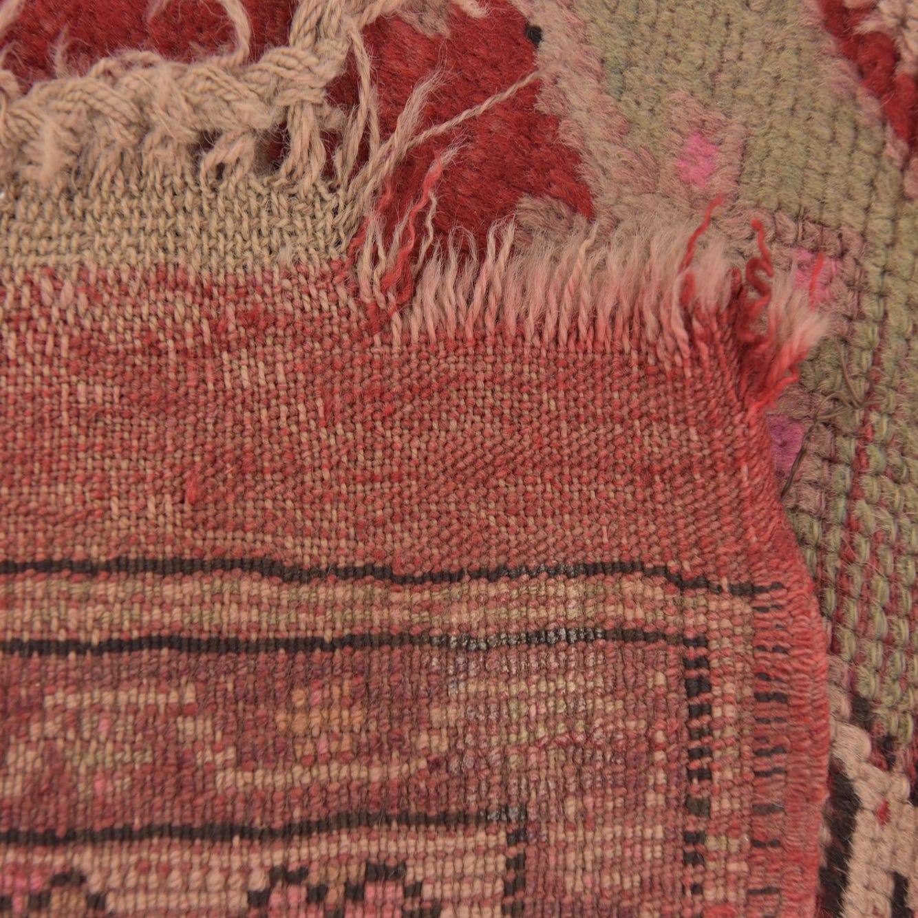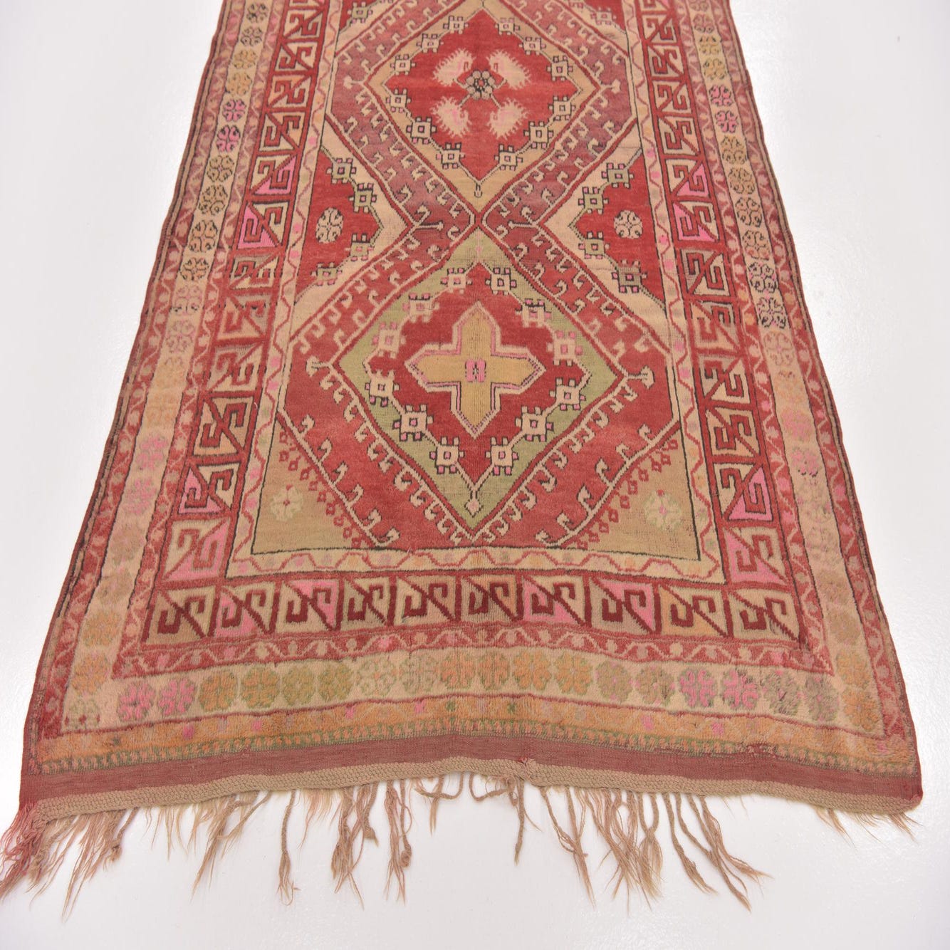 The low pile of the rug suggests a worn comfort, while small spot damage and missing fringe speak to its semi-antique status, hinting at a storied past. The runner’s stylistic qualities would complement interiors that embrace a rustic or vintage aesthetic, aligning seamlessly with both classic and eclectic décor. Additionally, it would serve as a striking visual corridor in long hallways or as a defining piece within an entryway.
