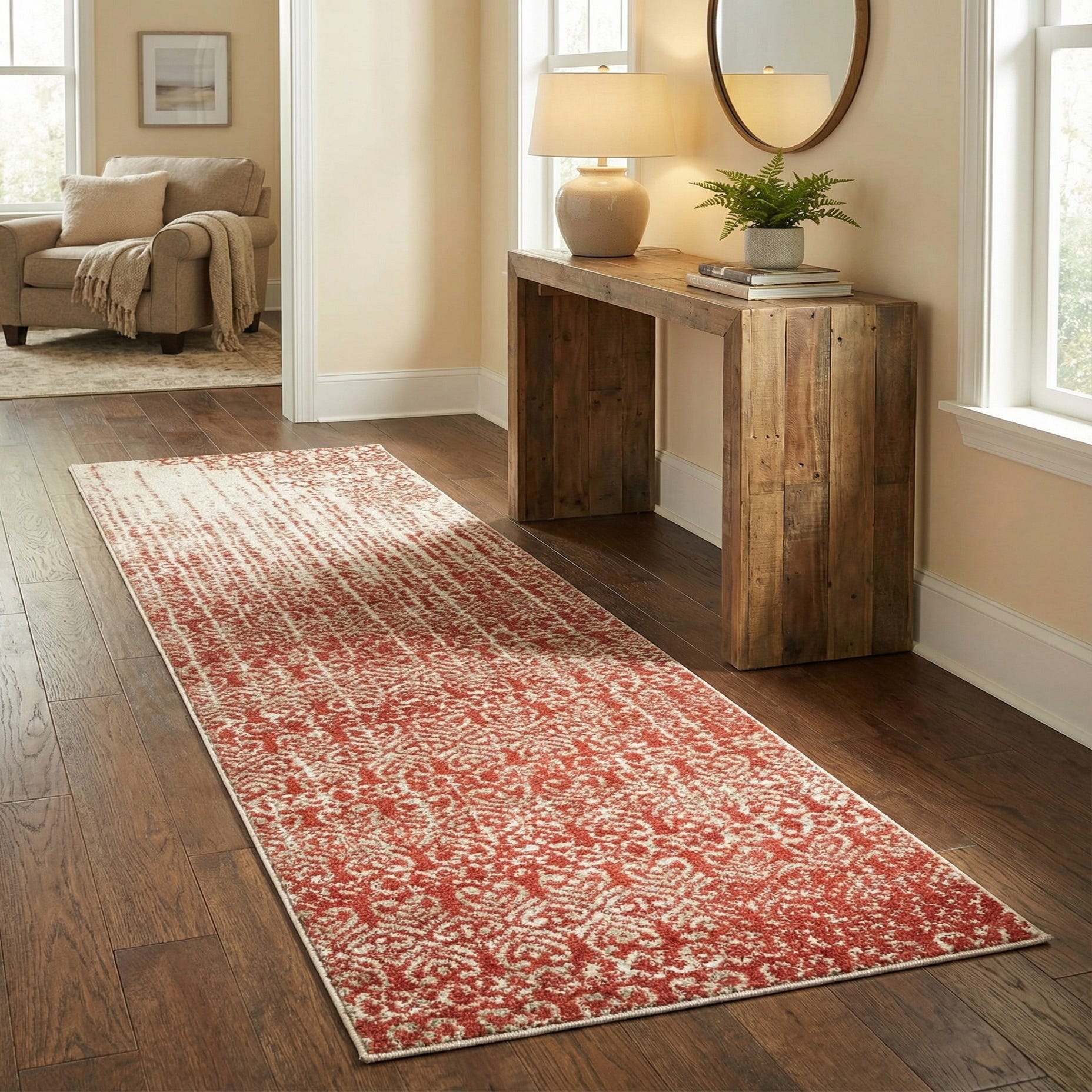 The Angelica Collection runner rug is a machine-woven piece crafted with 100% polypropylene, offering a combination of durability and soft texture that feels pleasant underfoot. This 8 Ft runner showcases a warm, red background with accents in beige, light brown, and terracotta, creating a harmonious color palette that evokes a sense of welcoming comfort.