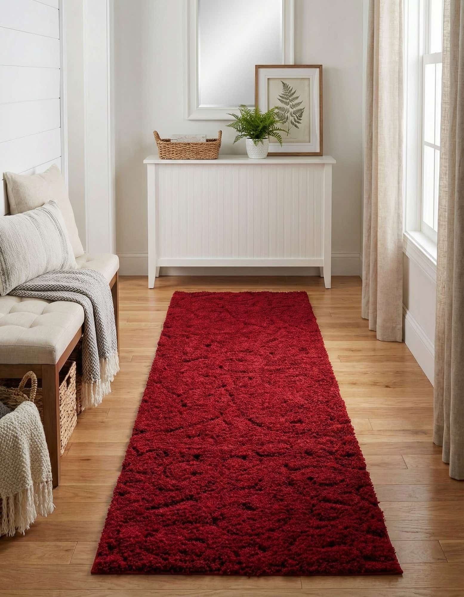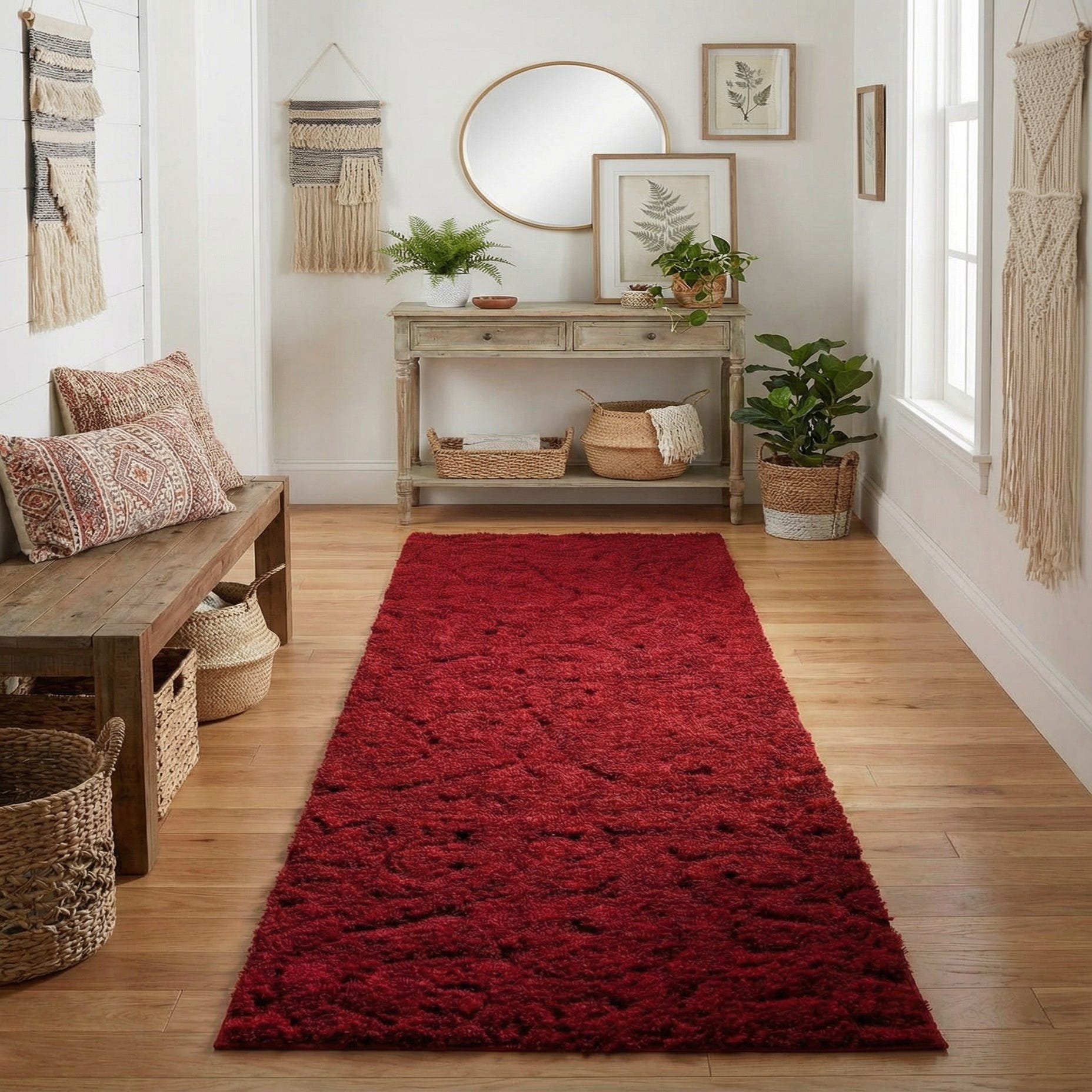 A plush, deep shag pile in a rich red background creates a warm, tactile surface that invites bare feet. Machine made from 100% polyester, the runner has a dense, cushiony hand and a subtle tone-on-tone texture—slight variations in the pile catch light and give the field a soft, layered look without a distinct printed motif. The overall style reads modern and pared-back, letting color and texture do the work rather than an ornate pattern.
