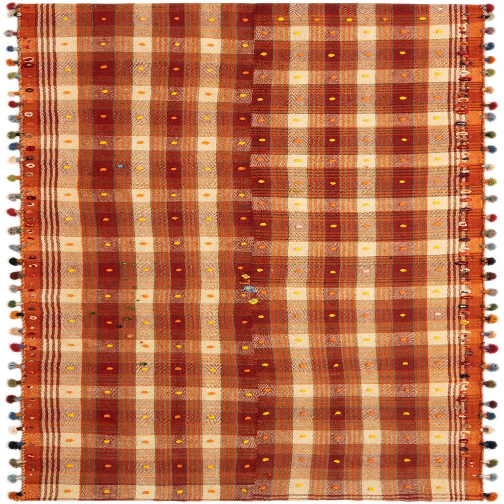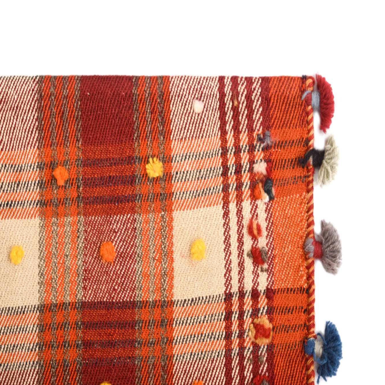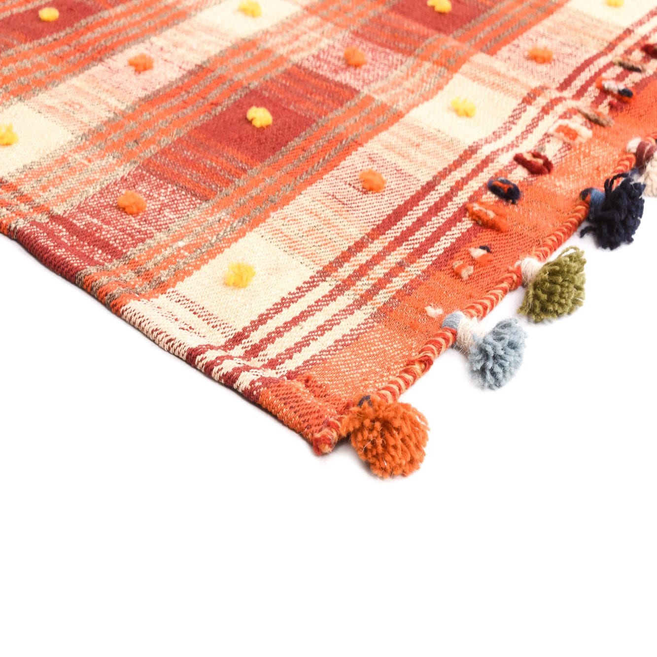 A handmade Jajim 8 ft runner rug featuring a plaid pattern in various shades of red, orange, and cream, accented with colorful pom-pom tassels along the edges.