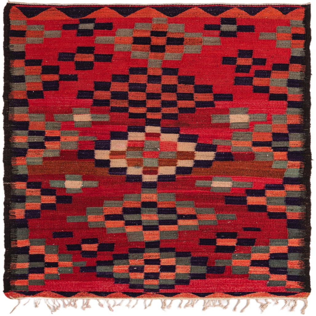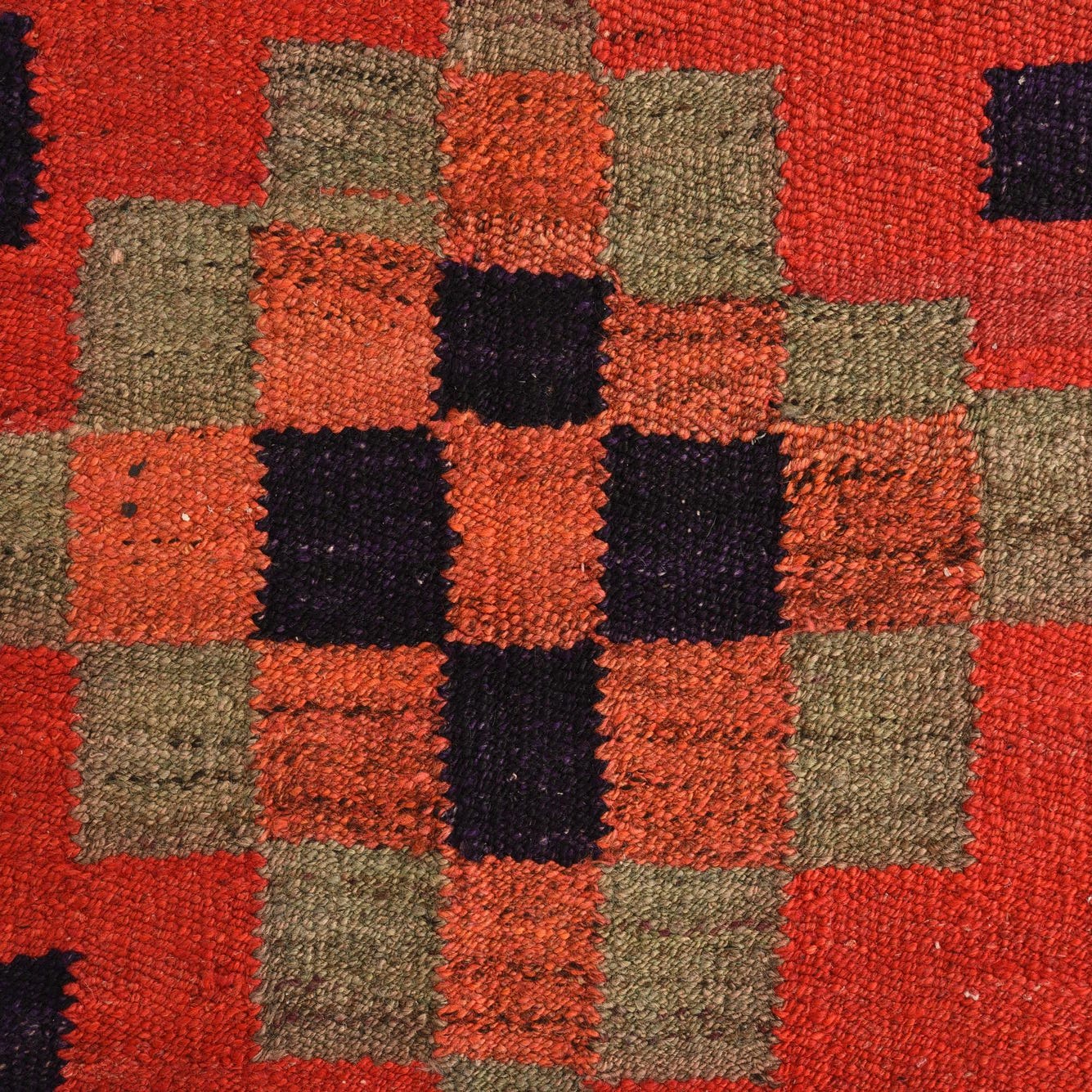 A vibrant 8 ft Kilim Fars runner rug with a red background and a geometric tribal pattern in black, orange, and green.