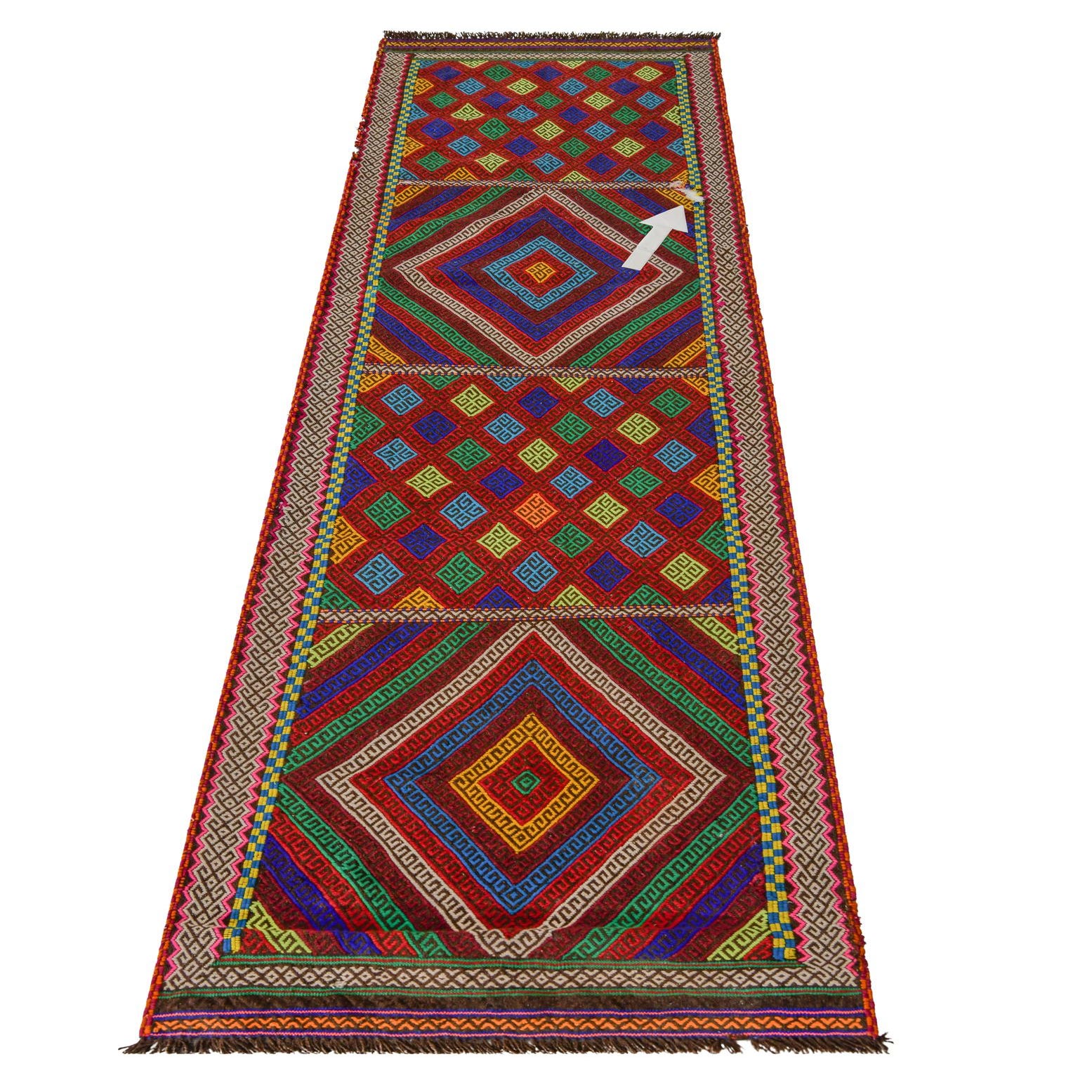 The Kilim Fars 8 Ft Runner is a hand-knotted textile that exemplifies traditional craftsmanship and timeless appeal. Crafted from 100% wool, the rug showcases a geometric pattern composed of diamond motifs that are skillfully outlined and filled with a multitude of vivid colors including red, beige, blue, brown, ivory, yellow, and light blue, all set against a rich red background. The bold, linear design is framed by a detailed border that echoes the primary pattern's angular aesthetic.